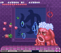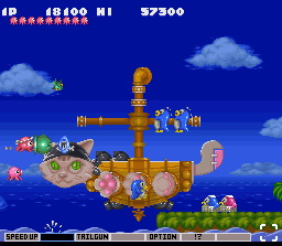Concernant les niveaux, je ne vais pas tous les détailler, même si ce n'est pas l'envie qui me manque. Dix niveaux différents sont disponibles, bien souvent, ce sont des versions des niveaux originaux de Gradius totalement revisités et qui n'ont plus grand-chose à voir avec l'original. Parmis les passages les plus marquant, notons l'attaque du Chat-Bateau dans le premier niveau, la danseuse du second niveau où il est nécessaire de slalomer entre ses gambettes, le quatrième niveau qui n'est autre que le Japon, avec ses sumos qui se balladent, et ses volcans qui crachent des aubergines (je suis à peu près sûr qu'il y a un jeu de mot là-dessous)