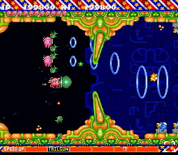 Rajoutant à cela un système de cloches venu tout droit de Twinbee. En tuant certains ennemis, des cloches apparaîssent à l'écran. En leur tirant dessus, elles changent de couleur, et en fonction de la couleur lorsque vous la récupérez, vous gagnerez différentes armes temporaires. Une cloche jaune ne rapporte que des points, une verte vous permet de grossir quelques secondes et d'être invisible pendant ce temps, la rouge vous offre un missile dévastateur, tandis que la bleue met à votre disposition trois rayons un peu moins puissant, enfin, la blanche vous fournit un porte-voix pendant quelques secondes et vos tirs sont remplacés par des cris très puissants ("PAS DE SUSHI CE SOIR", "C'EST NOTE", "PAS DE MARCHE ARRIERE", etc, etc) qui détruiront vos ennemis très facilement.