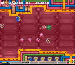 Parodius vous permet de piloter 4 engins différents Au menu, vous aurez le choix entre le Vic Viper, vaisseau original de Gradius, Octopus le poulpe, le vaisseau de Twin-Bee (autre série de Konami, un shoot'em up également, aux influences kawai relativement prononcées) et Pentaro le pingoun d'Antarctic Adventure, un jeu de course dont je parlerai peut-être un jour). Chaque pilote a des armes qui lui sont propres et je m'en vais expliquer le système du jeu.