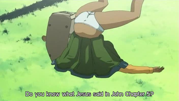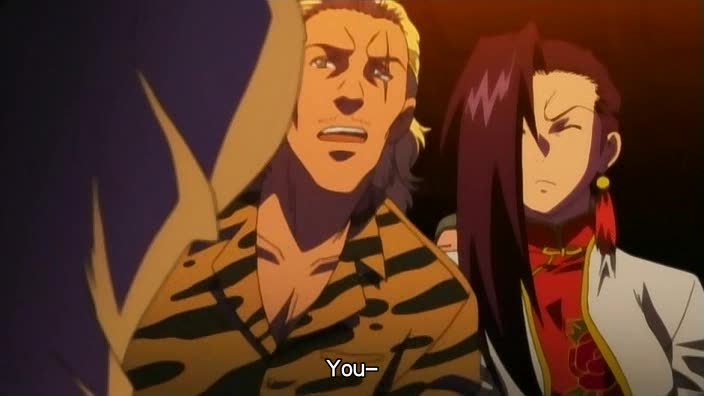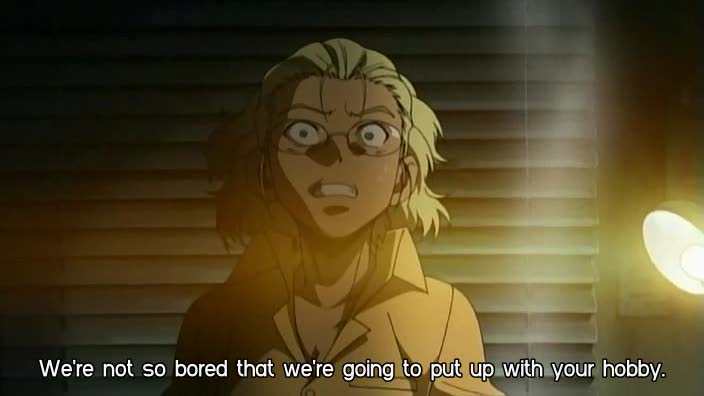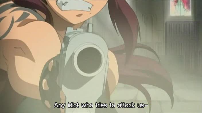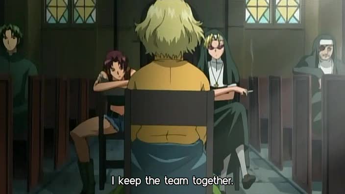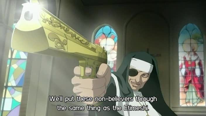 Pour le reste, deux bonnes scènes dans l'anime, totalement opposée d'un point de vue technique, car la première moitié de l'épisode finit sur une grosse scène de gun-fight, assez marrante puisqu'on a Revy et Eda qui n'en peuvent plus, qui suintent de partout à cause de la chaleur, pas de clim, elles sont sur les nerfs, alors nécessairement, quand une balle touche la porte de l'église et le verre de Revy, c'est la goutte d'eau en trop et les deux ne se sentent pas de joie. J'aime beaucoup la scène, avec les deux qui tirent comme des bourrines et le petit prêtre qui se ramène, l'air de rien, bonjour-bonjour, et qui se joint aux autres, et la soeur supérieure qui nous fait le final, sort sa belle arme dorée qui, d'une seule balle, renverse une des voitures des assaillants. Ca m'a fait marrer, d'un rire crétin quand on voit quelque chose d'exagérer, mais c'est pas grave.
