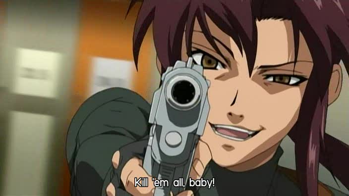 Sha-ka Chaka et sa bande et la pauvre petite se fait maltraiter. Mais heureusement arrivent Revy et Gin, chacun avec leur arme de prédilection, Revy et ses deux flingues et Gin et son katana qui coupe bien, et ils décident de faire le ménage au sein de la bande de l'affreux blondinet. Alors, je vous passe le détail de la scène qui oscille entre des *