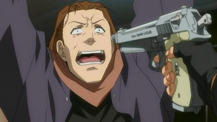 Au bout d'un moment, il n'y a plus grand monde, au milieu des cadavres avec un trou dans la peau et les autres amputés de quelques membres, il ne reste plus qu'à Revy et Gin à chercher le vilain pas beau. Celui-ci a bien évidemment décidé de prendre la poudre d'escampette, mais c'est Rock qui lui met en premier la main dessus et le méchant s'enquille un coup de