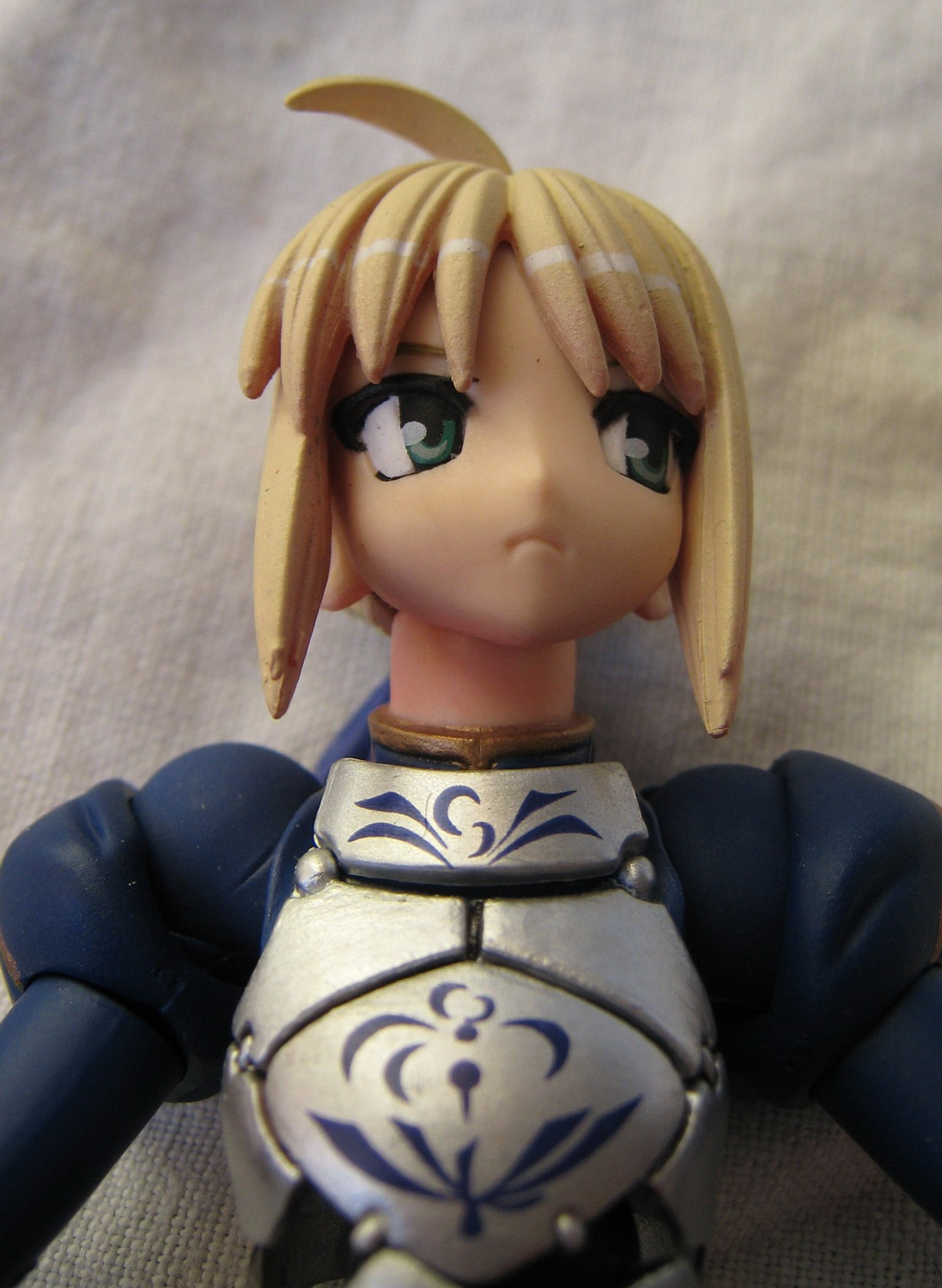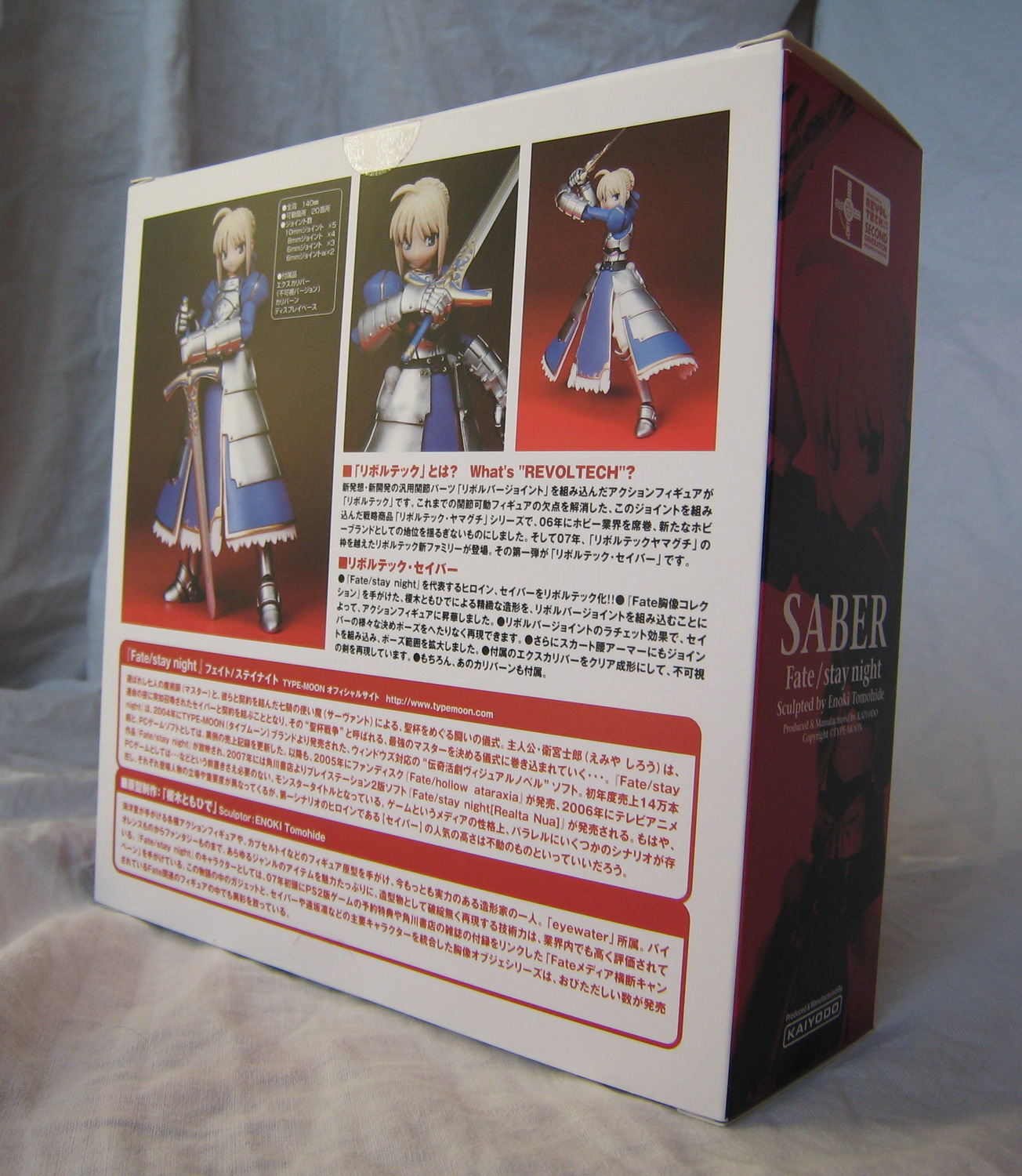 Troisième Revoltech, donc, Saber de Fate/Stay Night. J'avoue que j'avais un peu hésité avant de la prendre : Revoltech ? Figurine ? C'est vrai qu'il y en a de très belles de figurines de la série (que ce soit Saber, Rin ou même Sakura), mais le problème, c'est qu'elles sont chers... Au moins, un Revoltech, c'est toujours plus raisonnable, et pour prendre une photo, on peut s'amuser à faire un peu n'importe quoi. Chose amusante avec ce Revoltech, c'est la présence dans la boite d'un fond cartonné qu'on peut retirer et qui permet, comme c'est le cas sur pas mal de photo, d'avoir un fond en adéquation avec le sujet.
