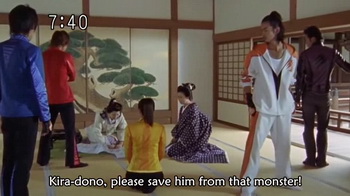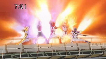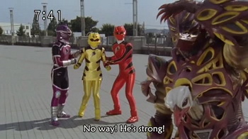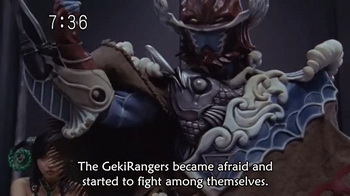 Là où Boukenger introduisait ses 5 héros dès le premier épisode (puis BoukenSilver bien plus tard), ici, il faut attendre le 23ème épisode pour voir le 4ème Gekiranger, Fukami Gou aka GekiViolet puis le 27ème pour que soit introduit GekiChopper de son petit nom Ken Hisatsu (si je ne me trompe pas, Ken = technique et Hisatsu > Hisatsu Waza = coup final). Même si les 5 se battent sans problème ensemble, on a pas la même unité d'un point de vue design des costumes puisque les 3 héros de base se ressemblent et les 2 suivants ont chacun leur style propre.