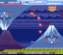 Le premier niveau du jeu se déroule sur une île tropicale, des pingouins roses et bleus vous attaquent de toutes parts. Ce seront d'ailleurs des ennemis réguliers à chaque niveau, même s'ils seront assaisonnées à l'ambiance de chaque monde, pour le reste, quelques orques, crabes et abeilles vous attaquent. Le clou du niveau est un immense bateau pirate à tête de...