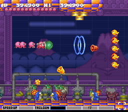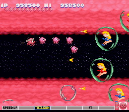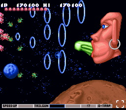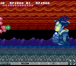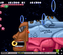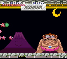 Concernant les niveaux, je ne vais pas tous les détailler, même si ce n'est pas l'envie qui me manque. Dix niveaux différents sont disponibles, bien souvent, ce sont des versions des niveaux originaux de Gradius totalement revisités et qui n'ont plus grand-chose à voir avec l'original. Parmis les passages les plus marquant, notons l'attaque du Chat-Bateau dans le premier niveau, la danseuse du second niveau où il est nécessaire de slalomer entre ses gambettes, le quatrième niveau qui n'est autre que le Japon, avec ses sumos qui se balladent, et ses volcans qui crachent des aubergines (je suis à peu près sûr qu'il y a un jeu de mot là-dessous)