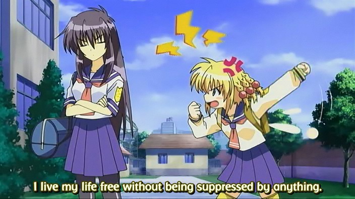 Pour le reste, l'anime se laisse regarder sans déplaisir, mais ça ne sera sans doute pas l'anime de l'année. A mettre dans la catégorie des comédies en milieu écolier sympathiques (les comédies, pas le milieu, d'où le "s" à la fin). Le design est honnête sans atteindre des sommets, mais on n'a déjà connu beaucoup plus moches (allez... Kanon... Ah bah oui, je sais, je triche si je prends l'anime le plus moche du monde).
