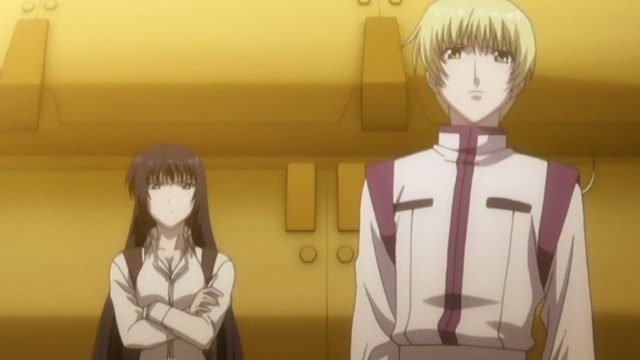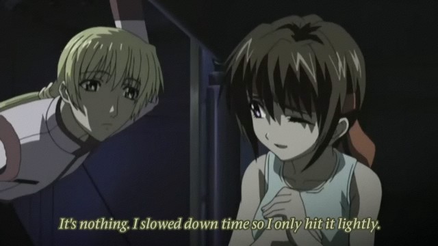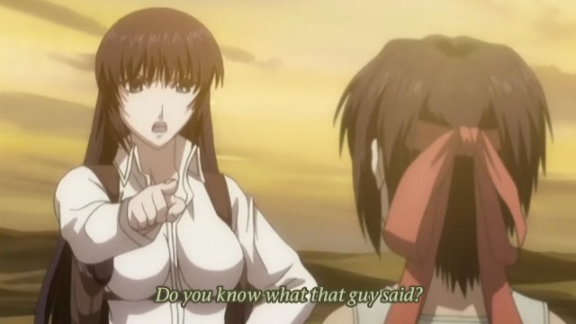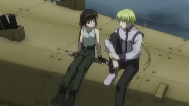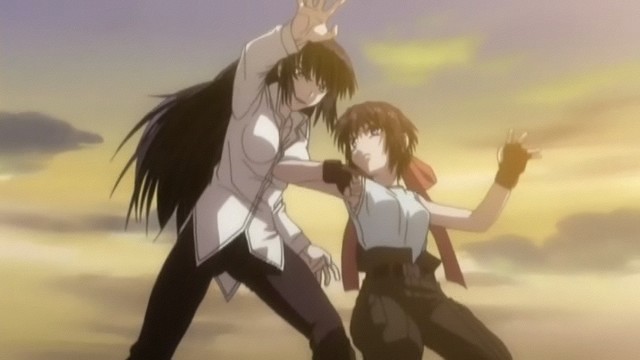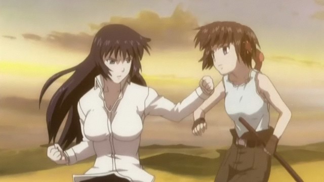 Bref, Paife prend les choses en main après que Bogie ait confirmé que l'homme qu'avait tué Honoka était le premier à qui elle ait ôté la vie. Et donc, sur une jolie musique mi-triste, mi-hypnotique, tout ce que j'aime, sur fond de coucher de soleil, les deux filles se mettent à discuter. Enfin, cheveux courts se fait engueuler et sermonner par cheveux longs (ouais, qu'est-ce qu'il ne faut pas inventer pour éviter les répétitions ?). Nan mais ça va pas ? Pourquoi tu flanches ? C'est le premier que tu as tué, ce sera pas le dernier ma fille ? Tu te reprends ou je te casse la gueule ? Tu veux te battre