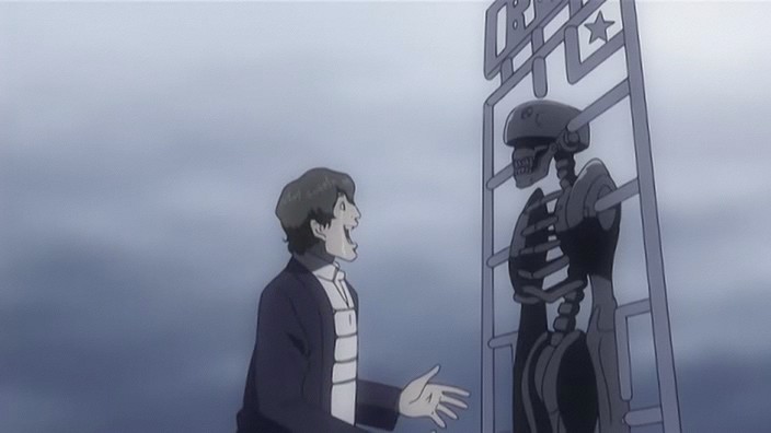 Enfin, il nous reste le méchant dans l'histoire dont le nom, cité une seule fois dans l'anime, m'a échappé. Un espèce de Pingouin (celui de Batman), le sourire narquois, qui offre aux hommes dans le désespoir ce qu'ils souhaitent. Evidemment, il s'en sert pour en tirer profit, et on peut s'attendre (en tout cas espérer) des épisodes relativement noirs, déséspérés ou les personnages se font avoir en beauté par le démon. Mmm, je n'arrive pas à trouver mes mots. Enfin, on verra si j'ai raison ou non. Et en plus, y a de l'