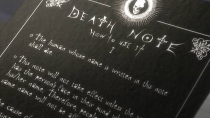 indications. Ce cahier est un Death Note. Toute personne dont le nom est marqué dessus mourra au bout de 40 secondes d'une crise cardiaque ou un peu plus si une mort bien particulière a été décidé. Seule condition pour que cela fonctionne, il est nécessaire de connaître le visage de la personne, cela évite de tuer deux personnes ayant le même nom.