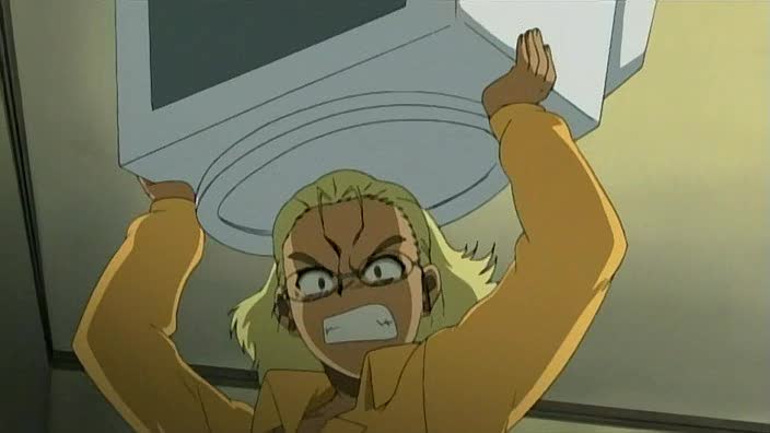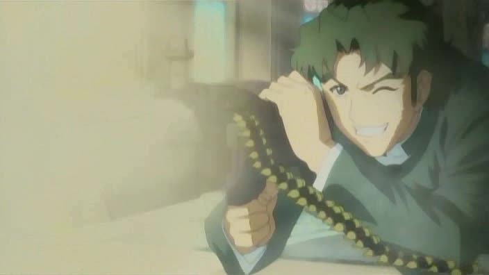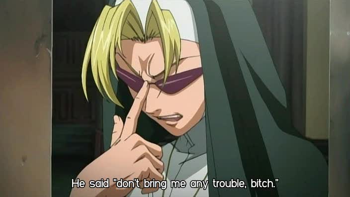 Pour le reste, deux bonnes scènes dans l'anime, totalement opposée d'un point de vue technique, car la première moitié de l'épisode finit sur une grosse scène de gun-fight, assez marrante puisqu'on a Revy et Eda qui n'en peuvent plus, qui suintent de partout à cause de la chaleur, pas de clim, elles sont sur les nerfs, alors nécessairement, quand une balle touche la porte de l'église et le verre de Revy, c'est la goutte d'eau en trop et les deux ne se sentent pas de joie. J'aime beaucoup la scène, avec les deux qui tirent comme des bourrines et le petit prêtre qui se ramène, l'air de rien, bonjour-bonjour, et qui se joint aux autres, et la soeur supérieure qui nous fait le final, sort sa belle arme dorée qui, d'une seule balle, renverse une des voitures des assaillants. Ca m'a fait marrer, d'un rire crétin quand on voit quelque chose d'exagérer, mais c'est pas grave.