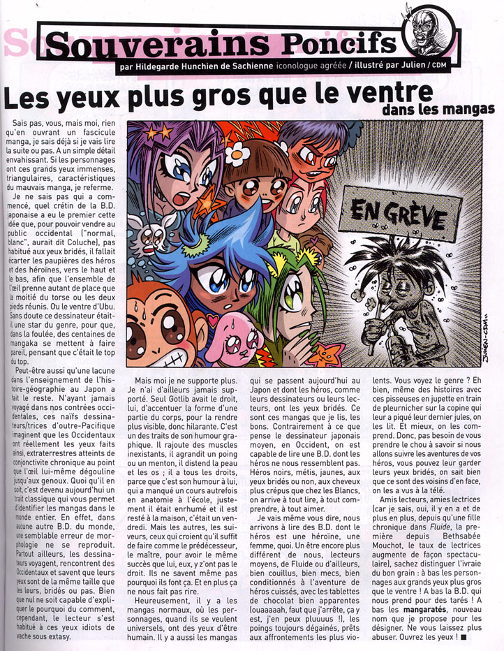 A croire que certains genres ne se mélangent pas. Oh, les comics ont commencé les premiers, Madureira s'imprégnant petit à petit de saveurs orientales dans son dessin, Sentai School est un bon exemple français de ce que peuvent donner des inspirations Japonaises, mais Fluide Glacial, ça reste Fluide Glacial. Alors, combien même j'aime Edika, Maester, Binet et les autres, il y a des trucs qui ne passent pas, et c'est avec un navrement (ça se dit ?) incommensurable que je me suis retrouvé à lire cet article il y a deux semaines alors que je faisais gaiement bronzette le long de la Méditerrannée. Alors, tout n'est pas à jeter dans cet article, ne serait-ce que parce que son auteur reconnait aimer certains types de manga, et même si je comprends le fond de son article, je ne pouvais que m'étouffer de rage devant la forme de celui-ci, et l'absence de recherche éhontée qui s'en dégage. Un crétin qui a inventé les grands yeux ? Tezuka se retourne dans sa tombe. C'est pour vendre à l'occident ? Depuis quand les Japonais produisent-ils des animes pour l'exportation ? (je dis pas que ça existe pas, mais faut pas déconner non plus, on se croirait revenu au temps du Club Do avec cet ennemi Japonais qui tente de nous envahir). Bref, on va dire que je monte sur mes grands chevaux de batailles (ou comment faire une expression à partir de deux), mais là, faut pas déconner.