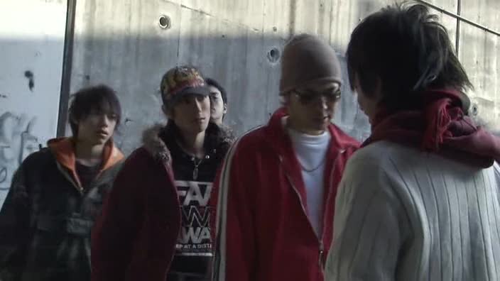 sort et lui demande de lui rendre l'objet. Il prend peur, s'enfuit, mais tombe encore sur la bande de voyous. Alors que ceux-ci s'en prennent à lui, Ryoutarou se transforme, le regard