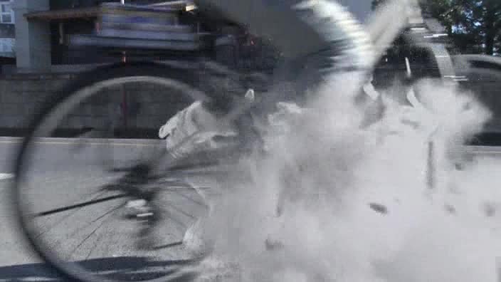 arbre. Un peu plus tard, une bouteille se casse devant son passage, ses pneus éclatent et il a le malheur de rentrer dans une bande de
