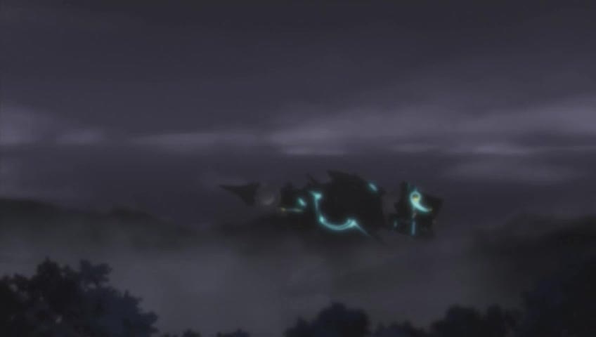 Junki qui s'éloigne du groupe, s'enfonce dans la grotte et son attention est attirée par un trou d'où se dégage une lumière, il perd conscience et voit deux machines en train de s'affronter. Le soir même, un peu plus loin, près d'un barrage de rétention, tombe une