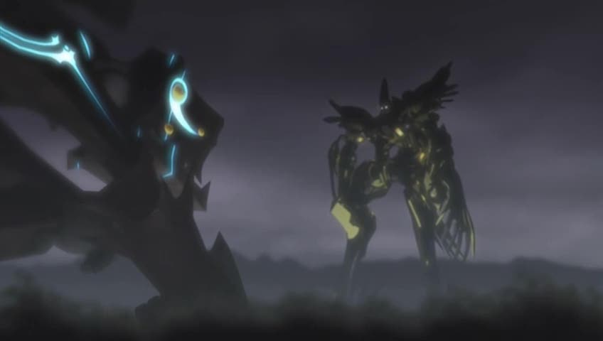 Et évidemment, ce qui saute aux yeux, c'est la technique. Le point d'orgue de l'épisode étant le combat entre les deux robots et pour nous tenir en haleine, l'épisode commence sur une preview du combat, avec la phrase clin d'oeil classique "oh non, je suis dans un robot, ça n'arrive que dans les manga, ça...", puis on a un deuxième petit plan pour conserver le spectateur, et enfin, on nous offre ce qu'on attend à la fin de l'épisode. Et techniquement, j'accroche complètement le design entièrement en CG des deux mechas. L'image est peut-être un peu sombre, mais le Reideen tout doré n'en ressort que mieux.