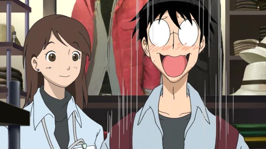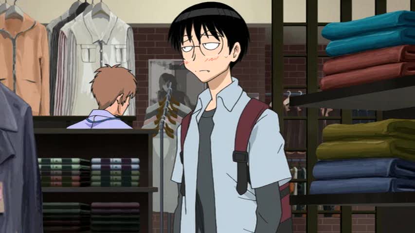 vendeuse alors qu'il regarde peinard les vêtements étalés, je me suis totalement retrouvé dans le personnage. Moi qui fais les boutiques au minimum, qui suis du genre à prendre un truc vite fait et aller payer parce que ça me saoule et à fuir les vendeurs comme la peste à moins de ne pas avoir d'autre choix que demander quelque chose. Le passage du magasin correspond vraiment à la définition des animes "tranches de vie" où tout va à vitesse réelle, en prenant le temps de montrer des détails sans intérêt (genre les pieds de Madarame quand il marche...)