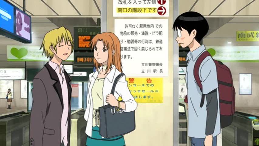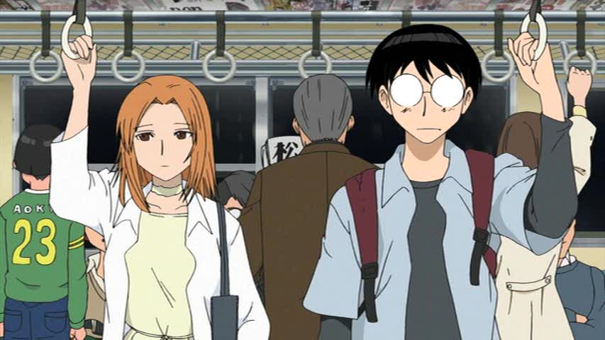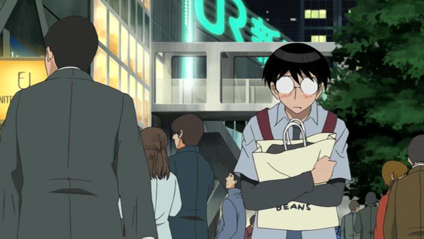 foutant de ses nouvelles montures qui dépareille totalement de l'ancienne version toute ronde. La discussion se met à glisser sur la mode et l'achat de vêtement et combien les otakus se sentaient sacrément étranger à tout cela, préférant investir en doujin, model-kit et autre joyeusetés, dépensant au minimum de l'argent en vêtements.
