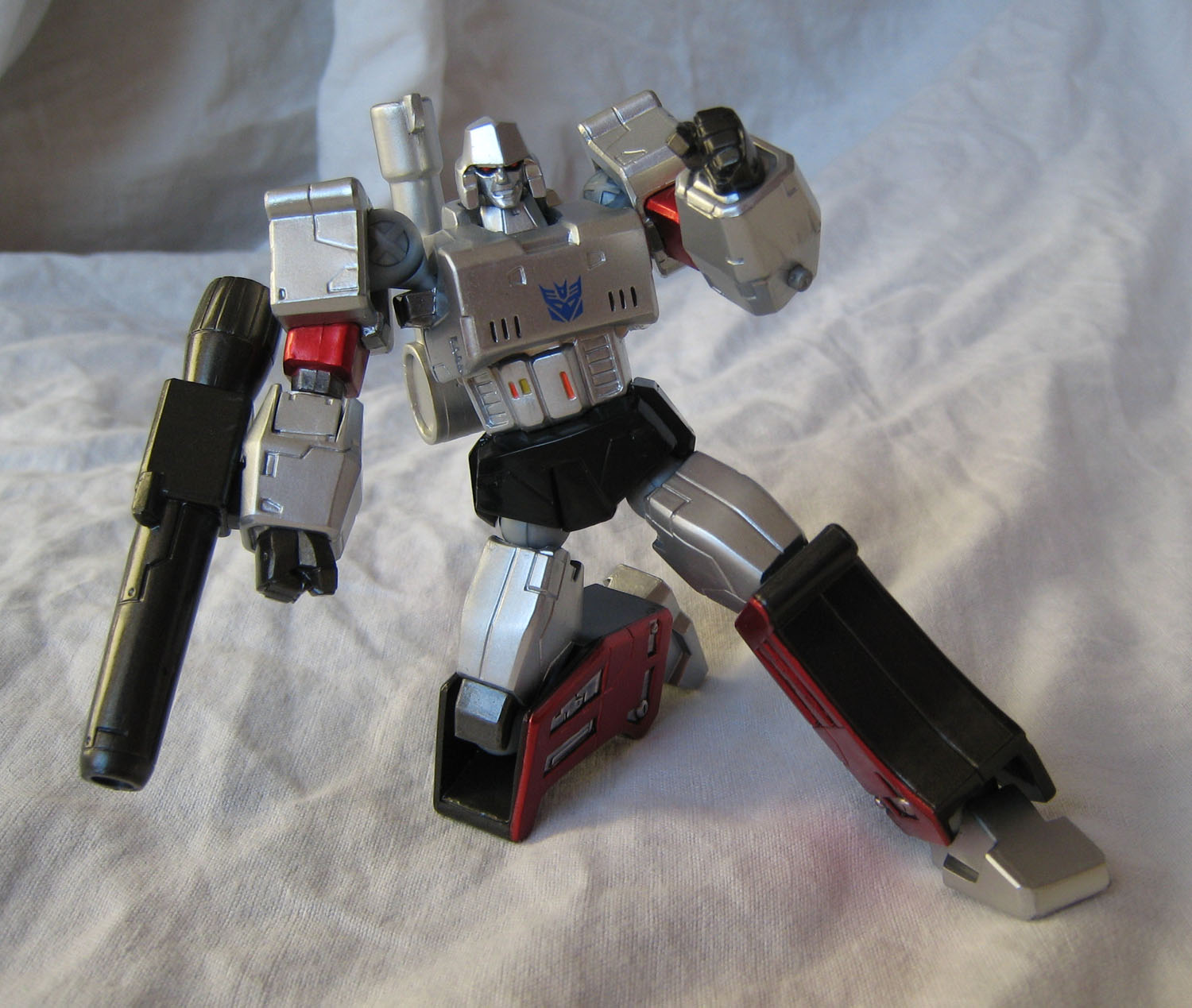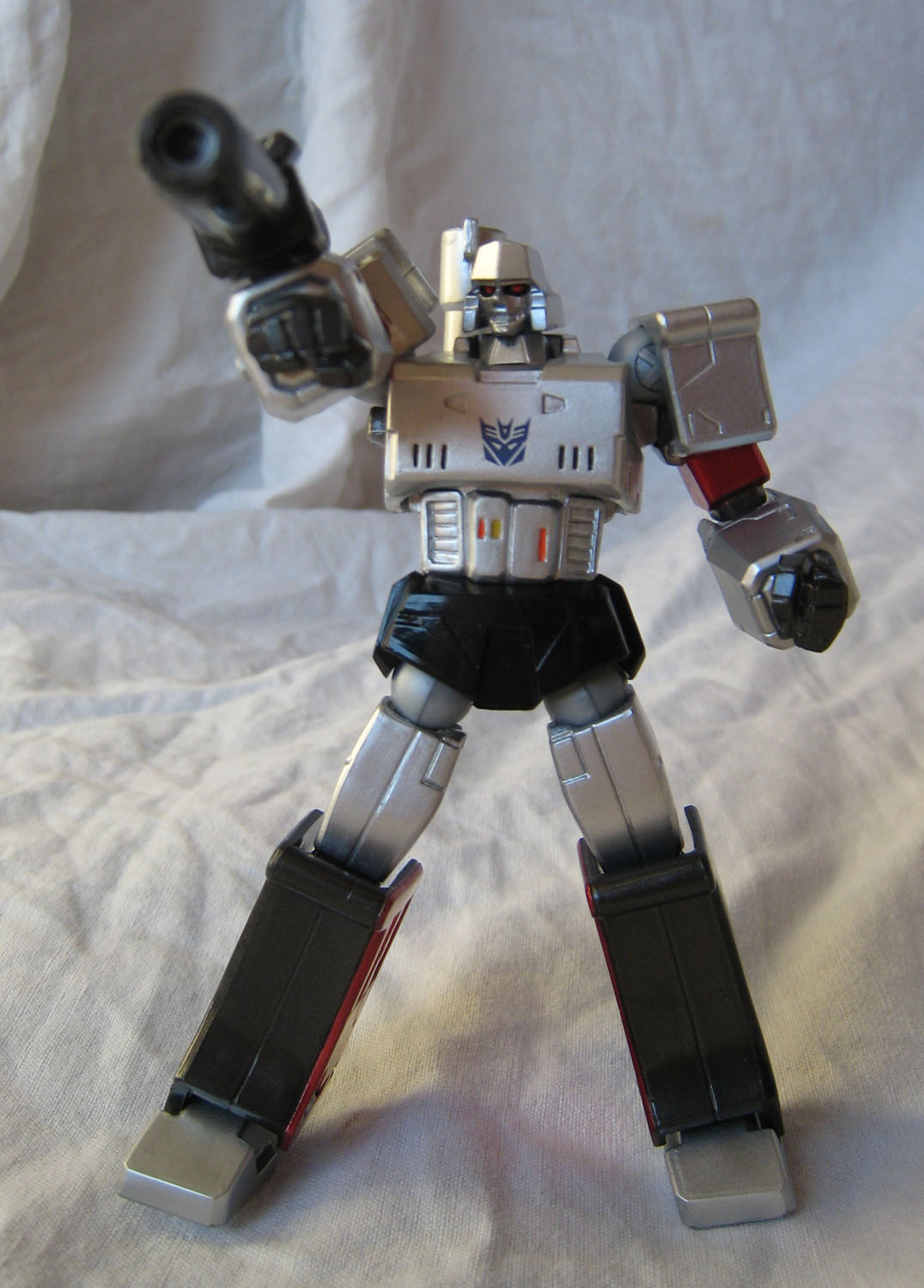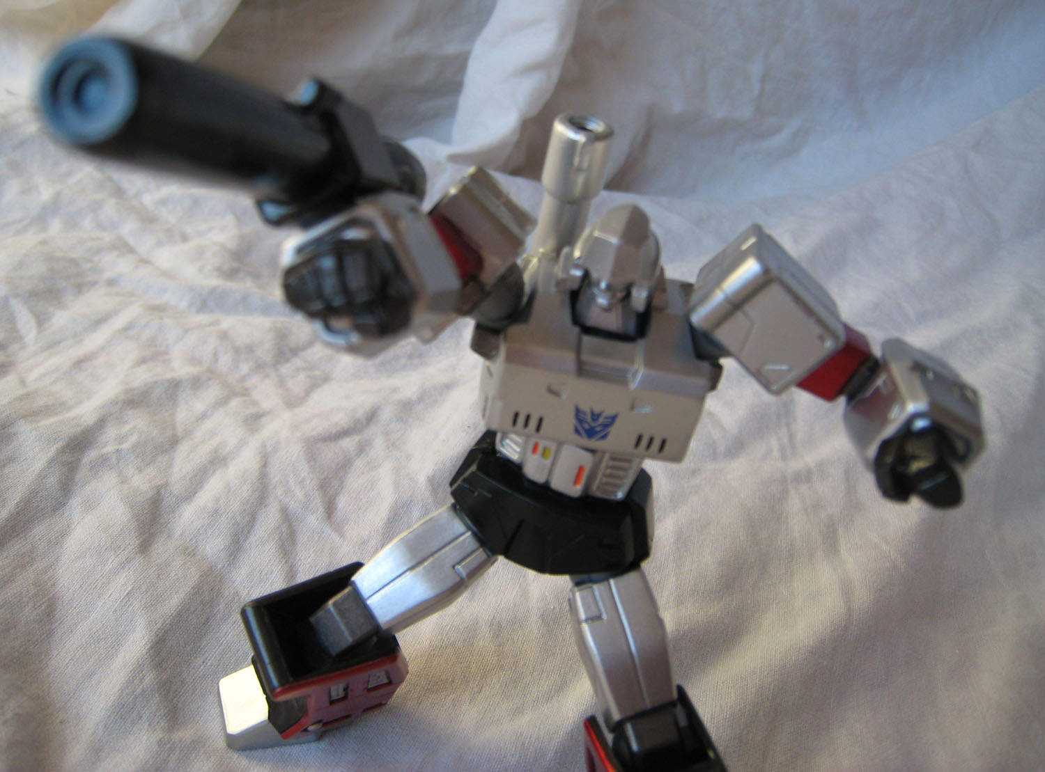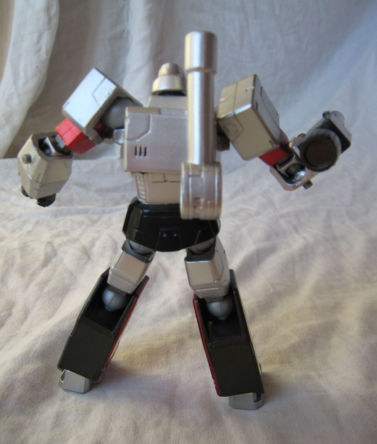 Que dire de ce Megatron ? Par rapport à Optimus, il ressemble déjà plus au personnage du dessin animé. La figurine perd un peu en mobitilité, notamment au niveau des bras puisque les grosses épaules du personnage bloquent les mouvements. Ne parlons pas non plus du canon sur le bras droit qui limite beaucoup les possibilités. Mais Megatron sans son canon sur le bras droit (nan, c'est pas Megaman), c'est pas non plus la même chose.
