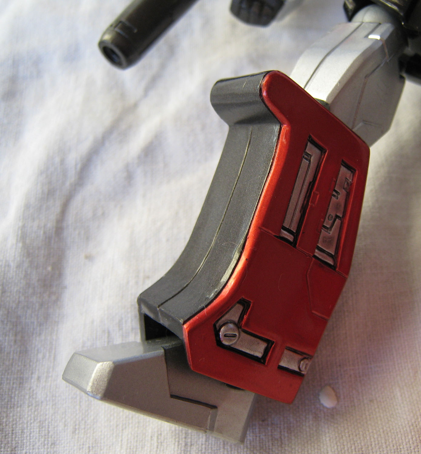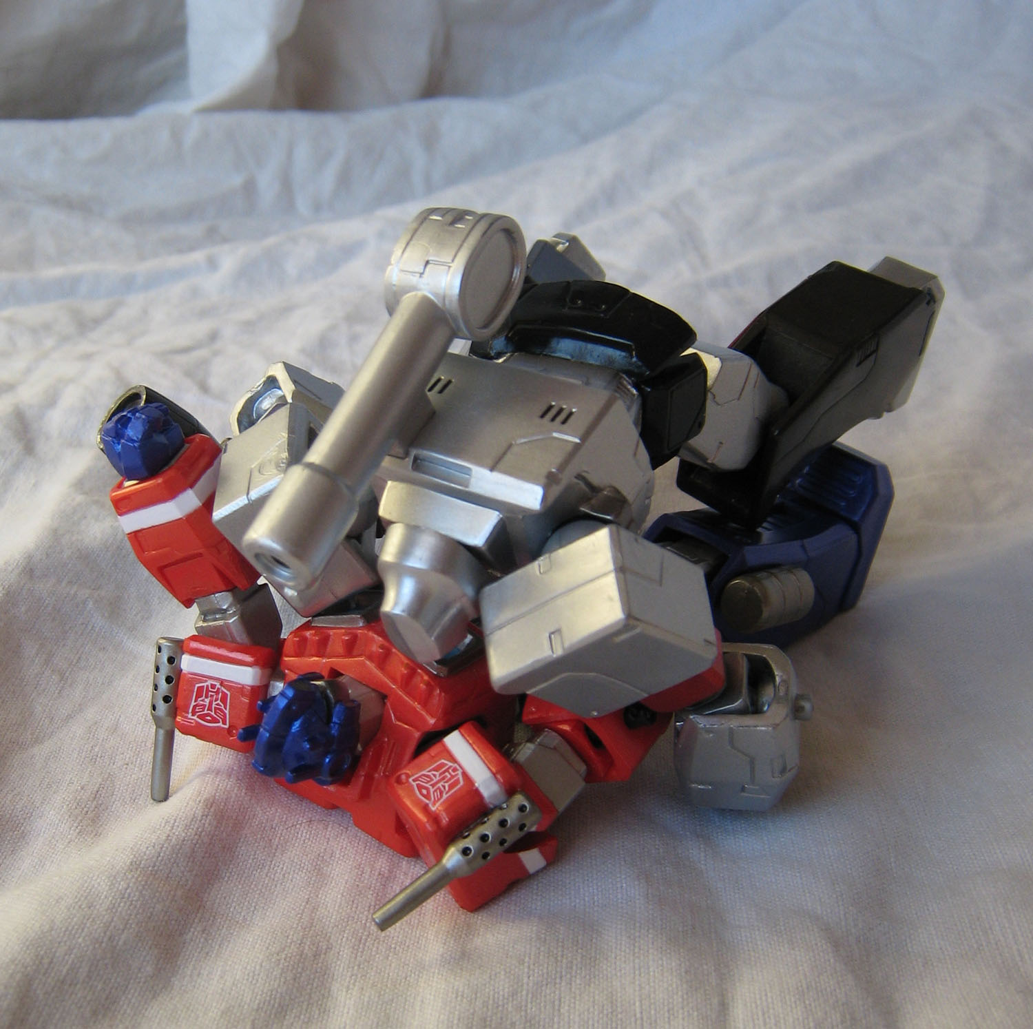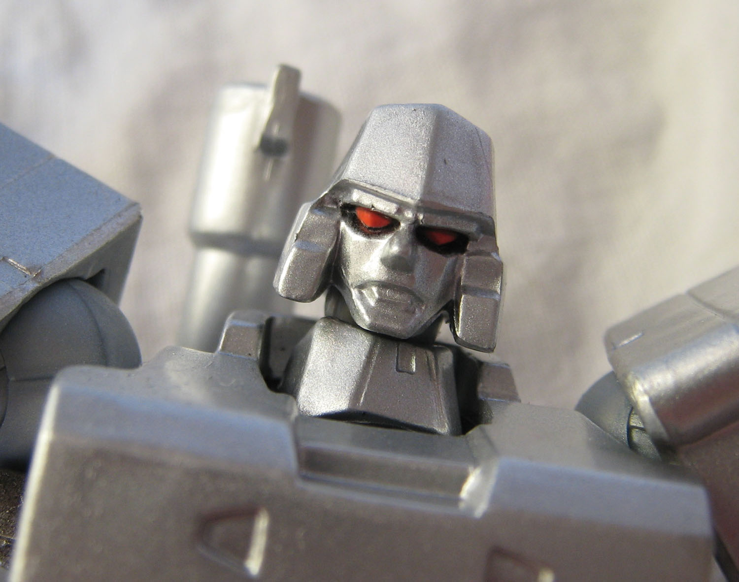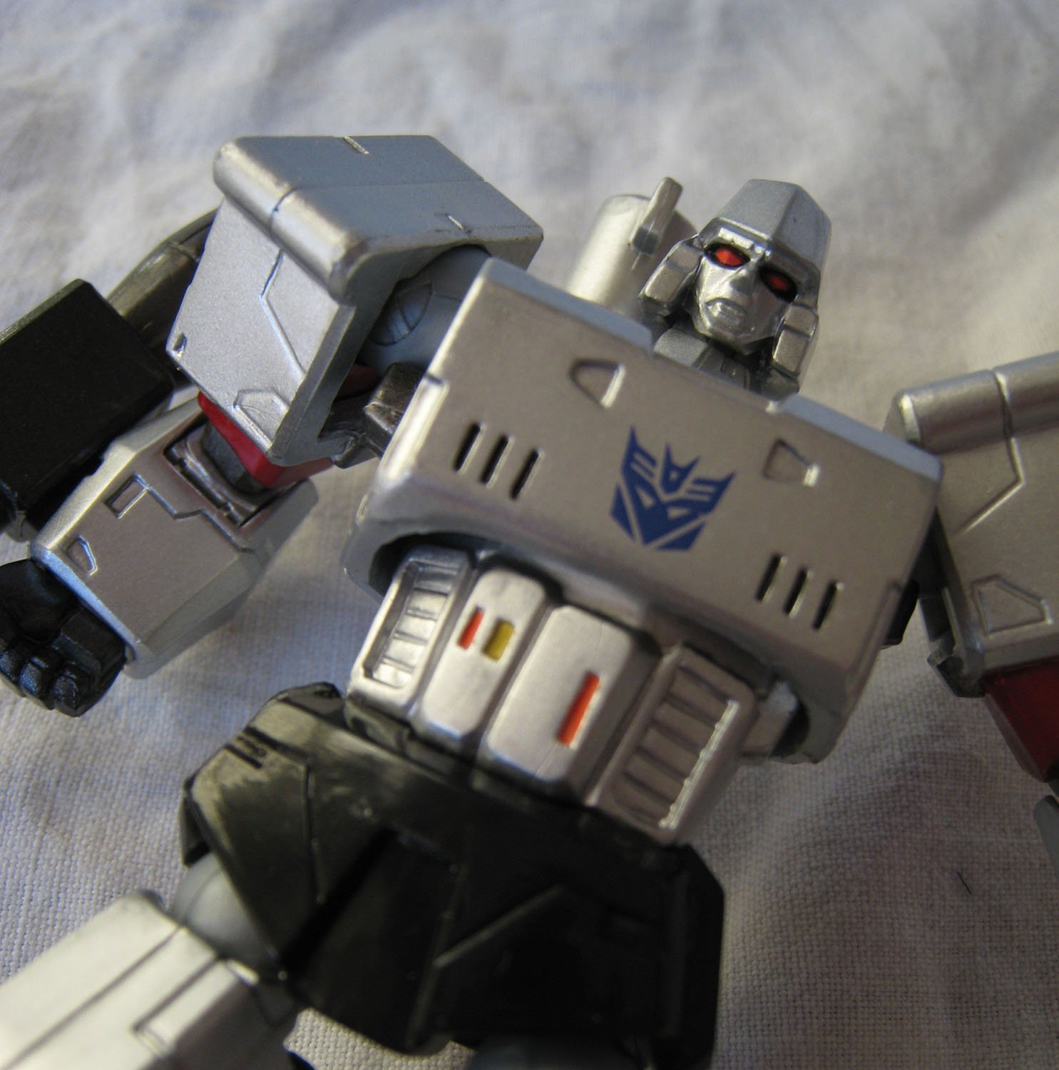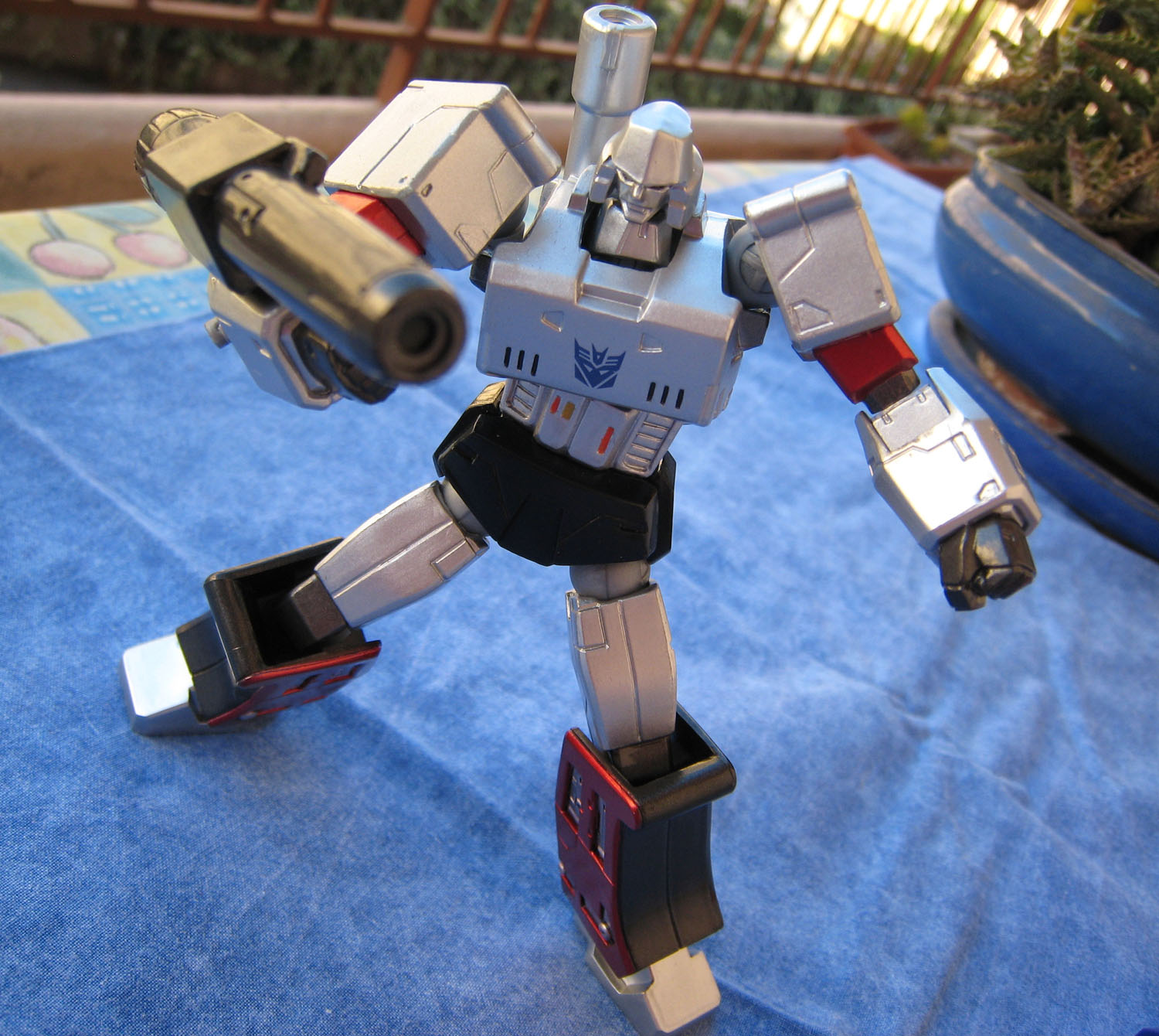 Que dire de ce Megatron ? Par rapport à Optimus, il ressemble déjà plus au personnage du dessin animé. La figurine perd un peu en mobitilité, notamment au niveau des bras puisque les grosses épaules du personnage bloquent les mouvements. Ne parlons pas non plus du canon sur le bras droit qui limite beaucoup les possibilités. Mais Megatron sans son canon sur le bras droit (nan, c'est pas Megaman), c'est pas non plus la même chose.