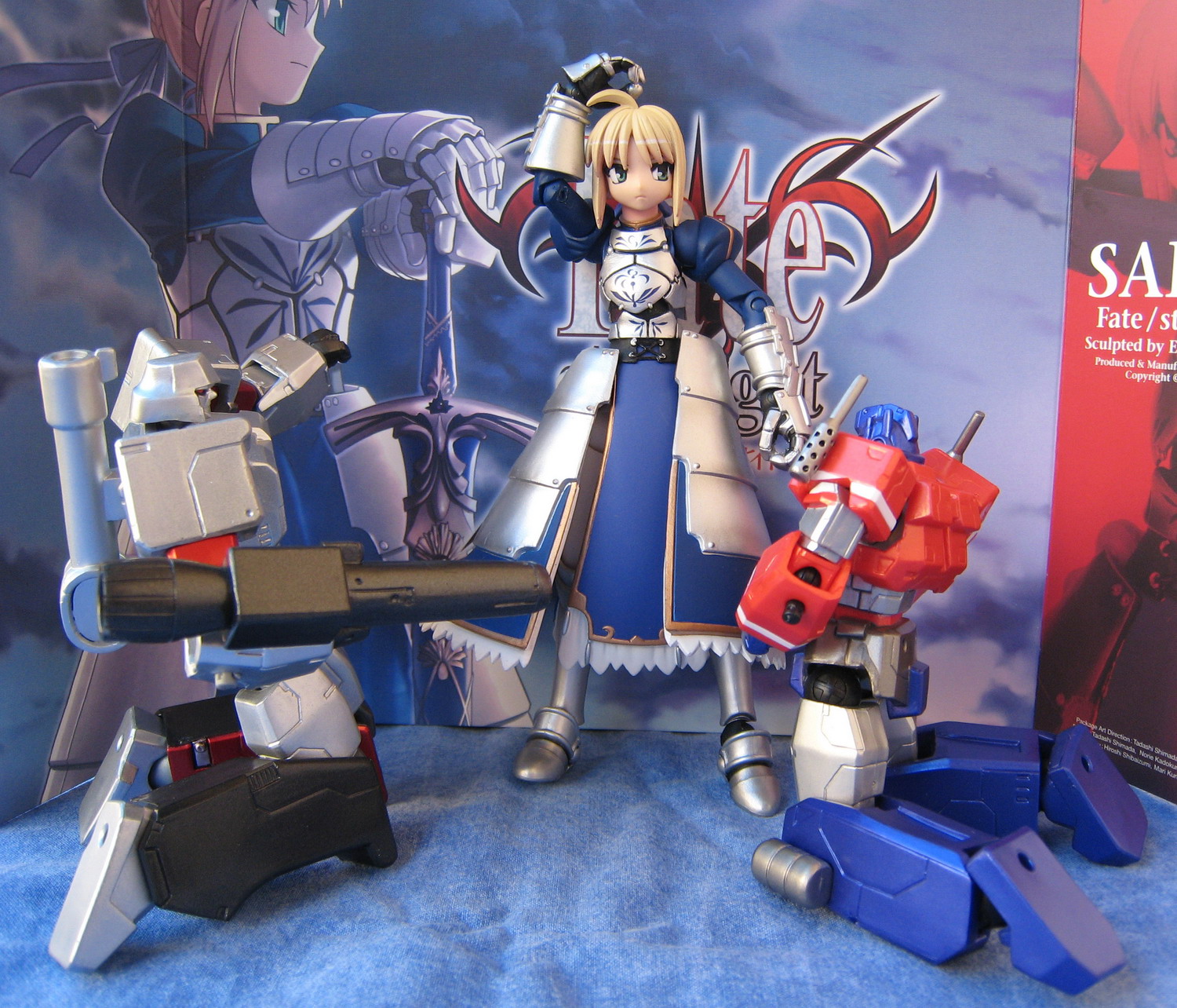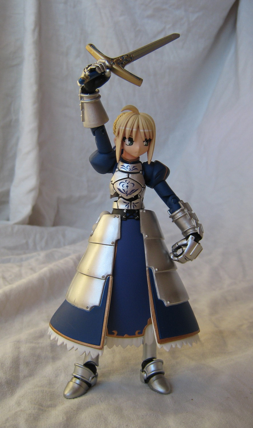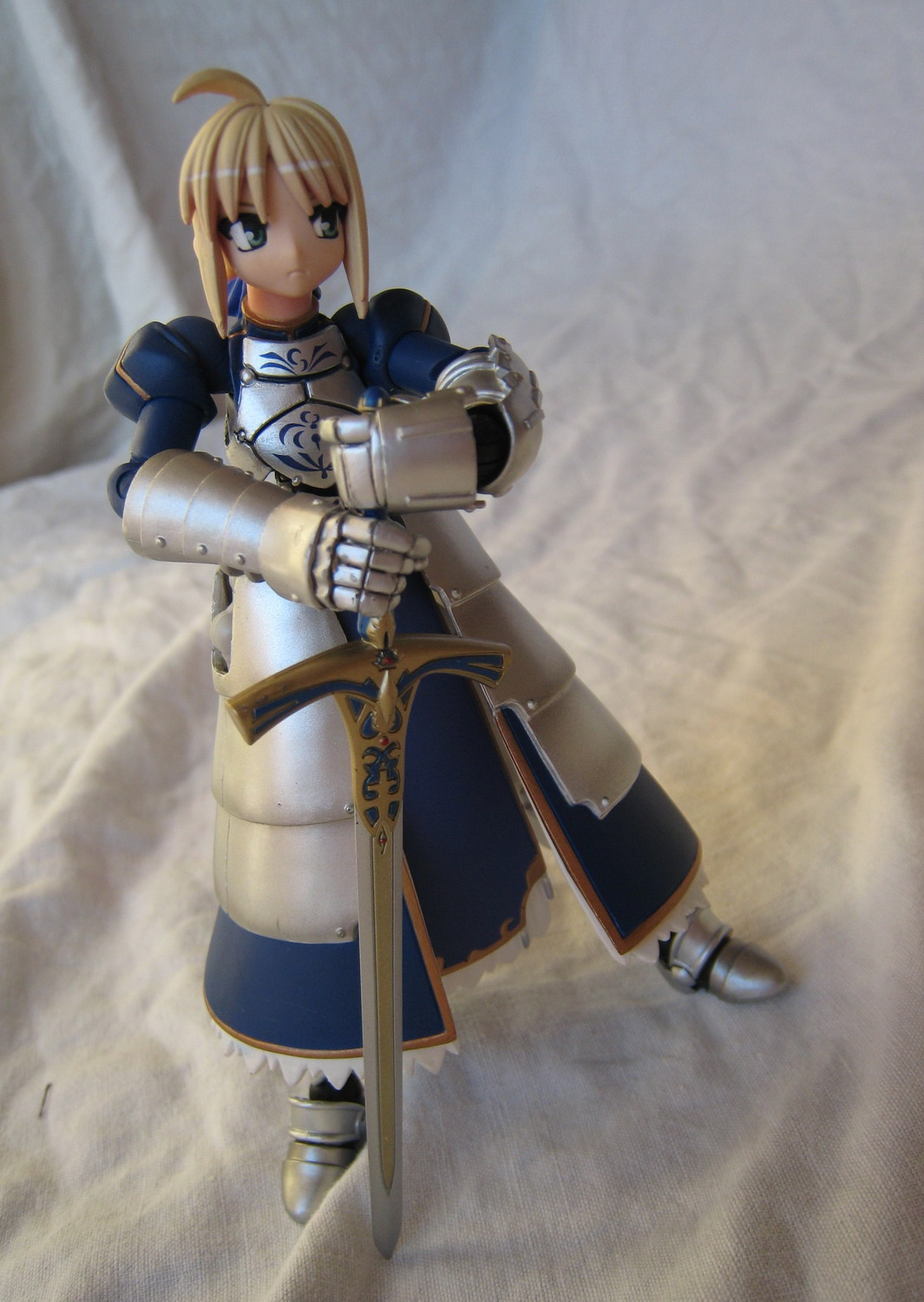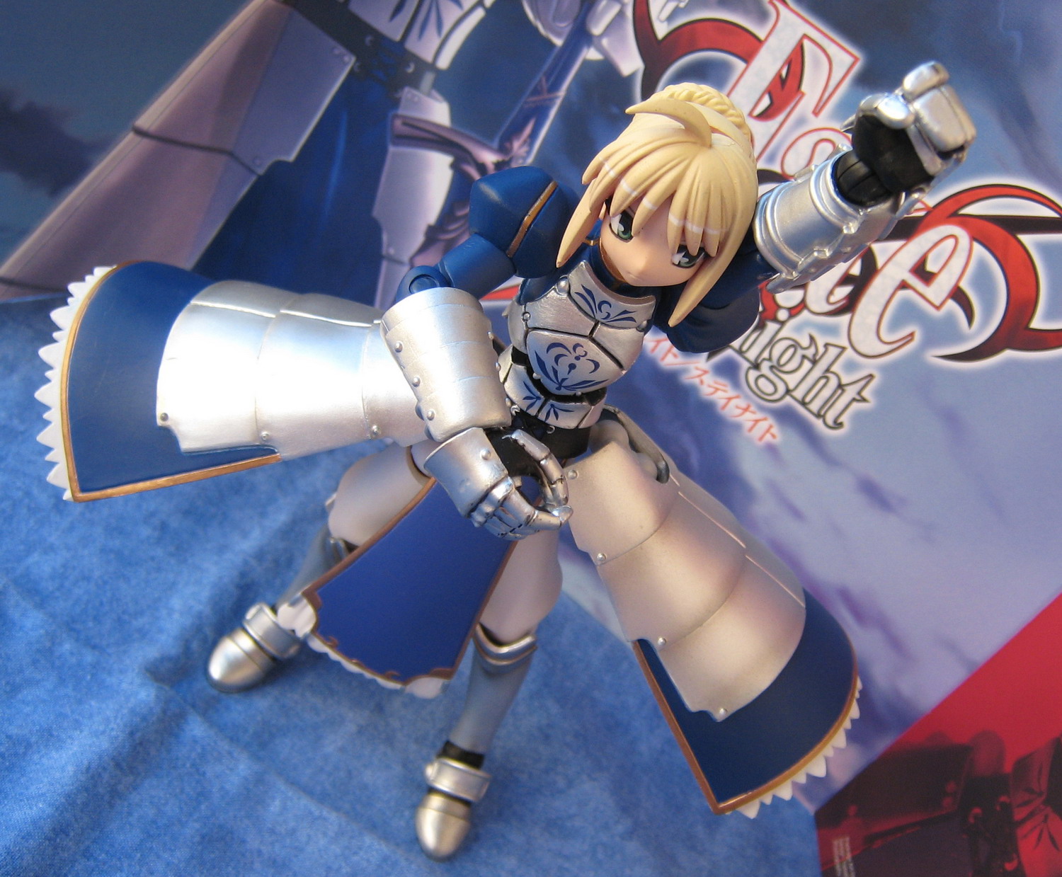 Troisième Revoltech, donc, Saber de Fate/Stay Night. J'avoue que j'avais un peu hésité avant de la prendre : Revoltech ? Figurine ? C'est vrai qu'il y en a de très belles de figurines de la série (que ce soit Saber, Rin ou même Sakura), mais le problème, c'est qu'elles sont chers... Au moins, un Revoltech, c'est toujours plus raisonnable, et pour prendre une photo, on peut s'amuser à faire un peu n'importe quoi. Chose amusante avec ce Revoltech, c'est la présence dans la boite d'un fond cartonné qu'on peut retirer et qui permet, comme c'est le cas sur pas mal de photo, d'avoir un fond en adéquation avec le sujet.