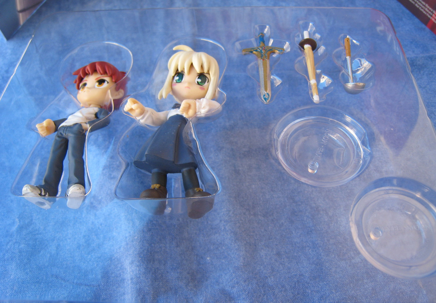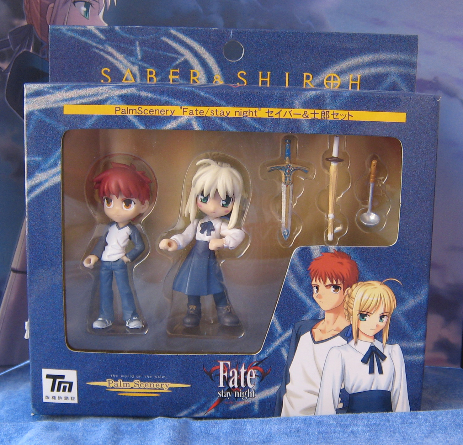 Bref, je m'exprime très mal je trouve. Avec cette figurine commandée, j'avais également pris un "Palm Scenery Fate/Stay Night", deux mini figurines de Saber et Shirou, disponibles avec trois petites armes : un épée, un sabre et une cuillière (!).