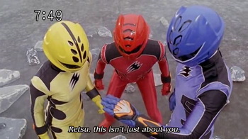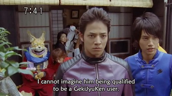 Là où Boukenger introduisait ses 5 héros dès le premier épisode (puis BoukenSilver bien plus tard), ici, il faut attendre le 23ème épisode pour voir le 4ème Gekiranger, Fukami Gou aka GekiViolet puis le 27ème pour que soit introduit GekiChopper de son petit nom Ken Hisatsu (si je ne me trompe pas, Ken = technique et Hisatsu > Hisatsu Waza = coup final). Même si les 5 se battent sans problème ensemble, on a pas la même unité d'un point de vue design des costumes puisque les 3 héros de base se ressemblent et les 2 suivants ont chacun leur style propre.