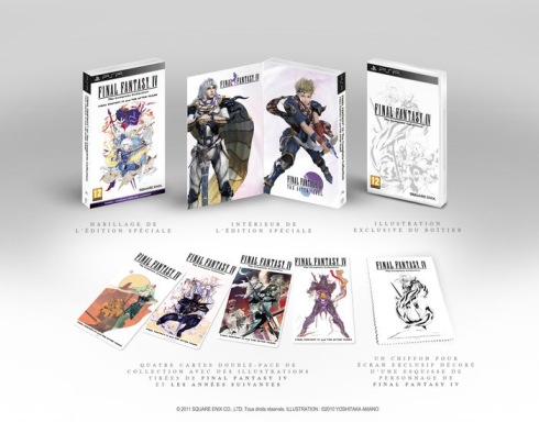 Et hop ! Encore un RPG, encore un Final Fantasy. Et dire que 15 ans en arrière, j'avais loupé l'occasion de posséder FFIV (FFII qu'on disait à l'époque) en version US sur Snes, je me suis depuis rattrapé puisqu'après l'opus DS (que je n'ai bien évidemment pas encore fait), c'est la version PSP que je n'ai pas hésité à acquérir, comptant sur la présence de The Years After, et son scénario bonus le liant au jeu original, pour me donner une bonne excuse pour mettre la main dessus. Ca plus le fait que ce soit une belle édition collector. Un peu plus petite que les éditions de Tactics Ogre ou Parasite Eve où le jeu était inclus dans une boîte en carton, là, il s'agit d'un fourreau cartonné, avec un rabat où sont inclus les bonus : quatre cartes (deux avec des dessins d'Amano) et un mouchoir avec Cecil dessiné également par Amano.