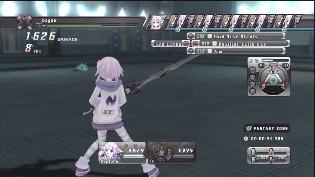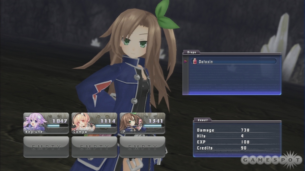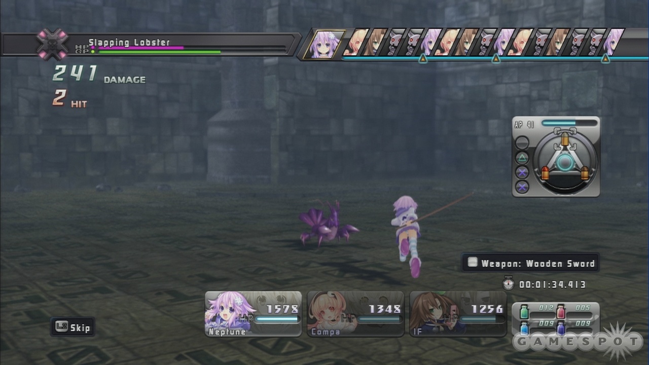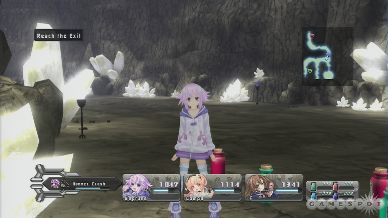 Ah oui, chaque personnage possède également une capacité spéciale à utiliser en donjon, Neptune peut détruire les blocs qui bouchent le passage, Compa peut appeler les ennemis et IF peut trouver les coffres cachés. A l'exception de Compa dont la capacité est nécessaire pour appeler l'ennemi mentionné au-dessus, le reste est plus une perte de temps qu'autre chose...