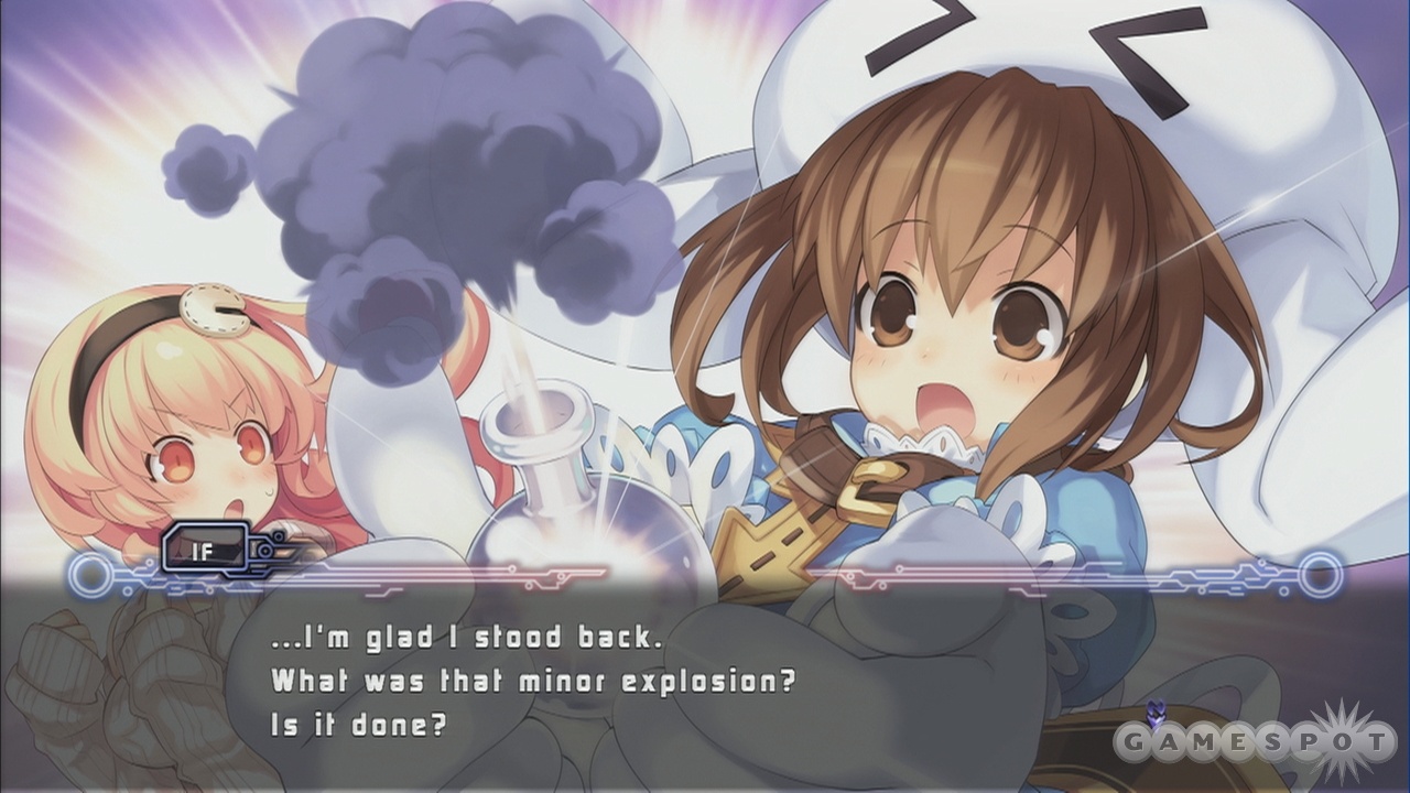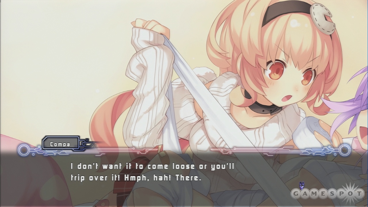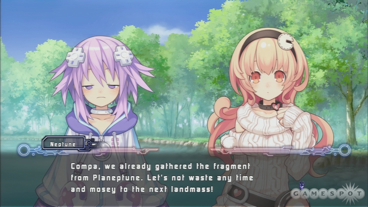 Pour ceux qui ne connaîtraient pas, HN démarre comme une grosse blague puisque le jeu se place dans le monde de Gamindustri, divisé en quatre régions, chacune dirigée par une déesse (des Console Patron Unit, autrement dit, des CPU) : Planeptune, Lastation, Lowee et Leanbox. Mais comme il y a quelque chose de pourri aux royaumes des déesses, un beau jour, Neptune est chassée de son royaume et atterrit sur terre la tête la première, lui faisant perdre la mémoire par la même occasion. Là, elle rencontre Compa, une jeune et jolie infirmière un peu naïve, puis, quelques temps plus tard IF, une aventurière au caractère trempé. Il sera possible par la suite de rencontrer d'autres personnages, notamment Nisa l'héroïne et Gust l'inventeuse (ainsi que les autres déesses en remplissant certaines conditions), mais dans les faits, ces autres personnages sont dispensables, personnellement, j'ai fait le jeu avec uniquement les trois héroïnes de base.