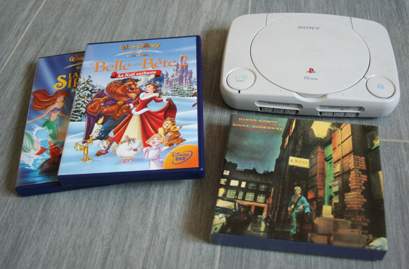 Et le reste des trucs trouvés à un autre vide-grenier. La PS1 n'est pas encore testée, mais si elle ne fonctionne pas, ça n'est pas grave, elle ne m'a coûté qu'1.