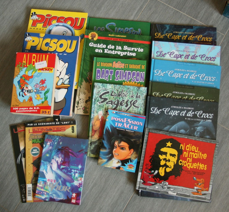 Compte rendu de la Foire aux Livres et un salon de la BD. La deuxième photo, c'était une offre avec tout ça pour 10, et la première, c'est ce que j'ai récupéré à droite, à gauche. Je suis quasi à jour sur les De Capes et de Crocs après des années de retard ! J'ai cherché du Larcenet, mais je n'ai quasi rien trouvé... Dommage, j'aurai bien pris les Retour à la terre et les Combat ordinaire qu'il me manque !