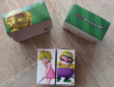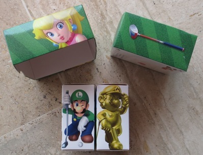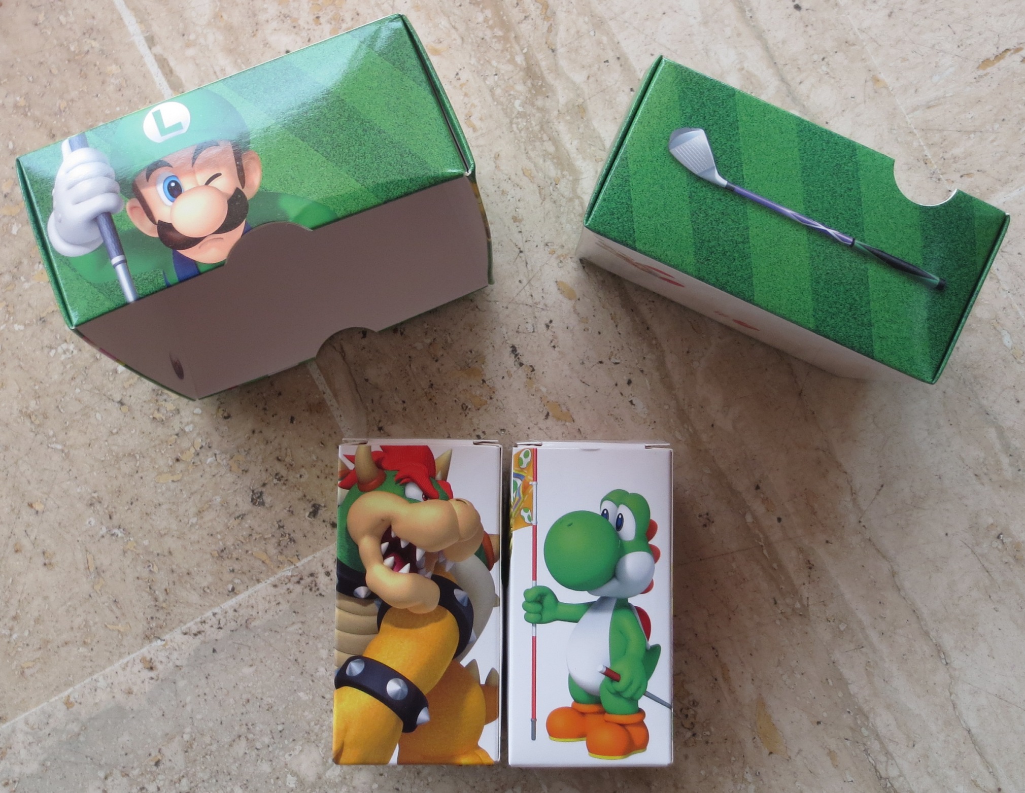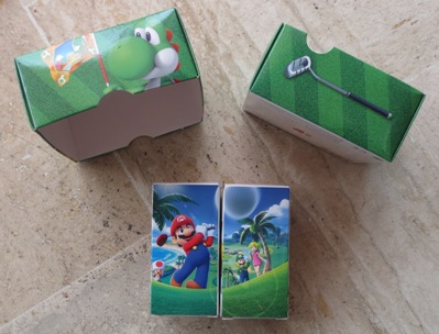 C'était très amusant, j'ai reçu le même jour Mario Golf sur 3DS, commandé sur leboncoin, et mes balles de golf Mario, récupérée sur le Club-Nintendo (faut bien en profiter tant qu'on peut échanger des points...). C'est du goodies qui ne sert à rien (pléonasme) mais comme souvent chez Nintendo, ils font bien les choses. Les 4 balles sont dans 2 boîtes elles-même enfermées dans une autre boîte, et chaque face de chaque boîte propose une image différente.