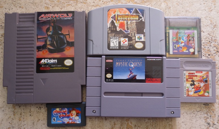 On commence avec un arrivage de jeux commandé sur eBay, le tout vient des USA. Je n'ai pas fait exprès, mais chaque jeu est pour une console Nintendo différente : Nes, Super Nes, Nintendo 64, GB, GBC et GBA. Airwolf n'est pas le jeu du siècle, mais il fait parti de ces jeux que je possédais quand j'étais plus jeune et comme j'essaye de tous les récupérer... Castlevania et Mystic Quest font tous les deux parties de séries que je collectionne... Et sont tous les deux des jeux qui sont connus pour être parmi les plus mauvais de chaque série... Mystic Quest, je l'avais à l'époque, ça n'est pas mauvais-mauvais, c'est juste que comparé à un FFVI par exemple, ça ne tient pas la route.