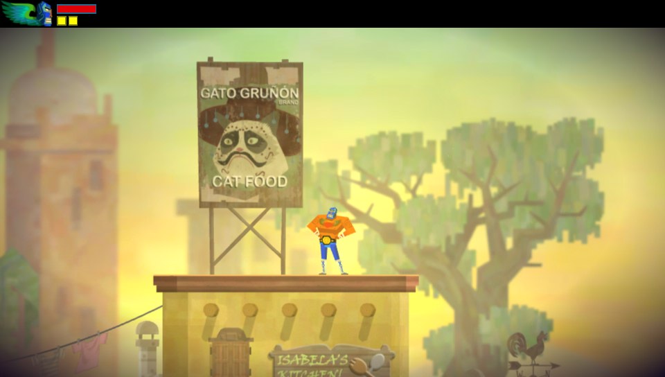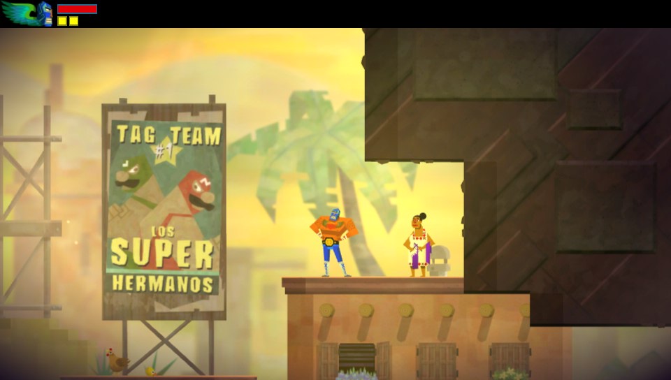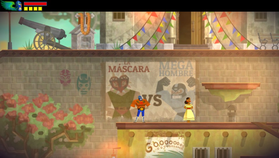 Guacamelee, c'est l'histoire d'un gentil héros muet qui voit la fille dont il est amoureux enlevée par un vilain méchant. Tout cela est très classique, sauf qu'il faut placer le décor : le jeu se déroule au Mexique ! Avec ses tacos, sa musique, son jour des morts, et Juan, le héros qui trouve un masque magique qui le change en luchador, un catcheur aux pouvoirs incroyables !