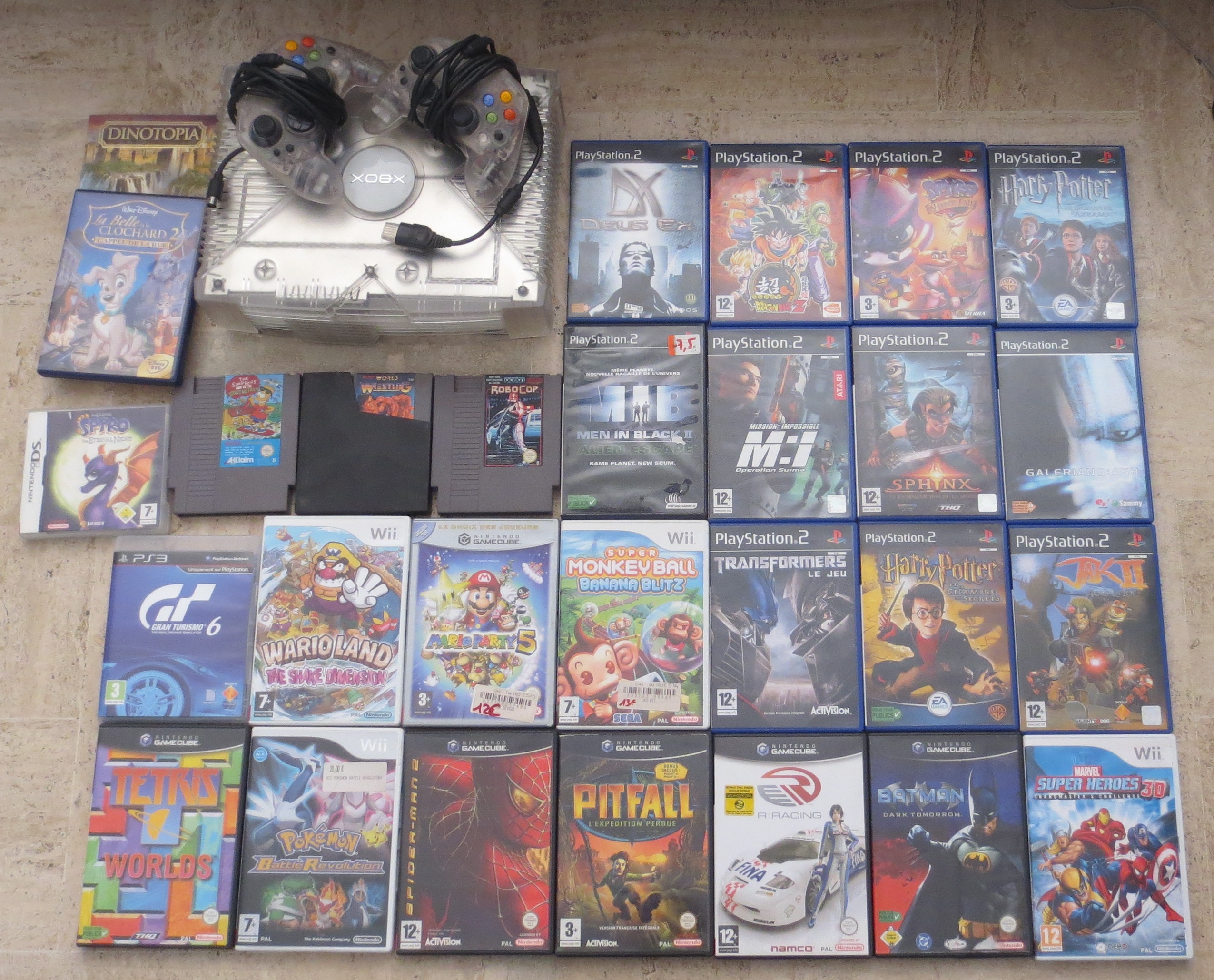Retour de deux vide-greniers dimanche. La Xbox Crystal est super belle et ne m'a coûté que 5 (du coup, si elle ne fonctionne pas, je revends les manettes et je suis sûr que je me rembourse !). 3 jeux Nes pour 1, c'est toujours bon à prendre. Les jeux PS2 m'ont coûté moins d'1 chacun (sans être exceptionnels, ce ne sont pas de mauvais titres).