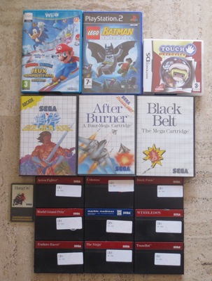 Passage à Cash Express où j'ai fait le plein de jeux Master System à pas cher. 390 ou 490 pour les jeux en boîte, et 90c pour les jeux en loose. Ce qui est marrant, c'est que sous l'étiquette à 90c, il y avait d'autres étiquettes à 4, comme s'ils avaient baissé les prix, or c'était la première fois que je voyais ces jeux en magasin... Je ne sais pas s'ils les avaient planqué en réserve, mais bon, à ce prix-là, peu importe, je prends.