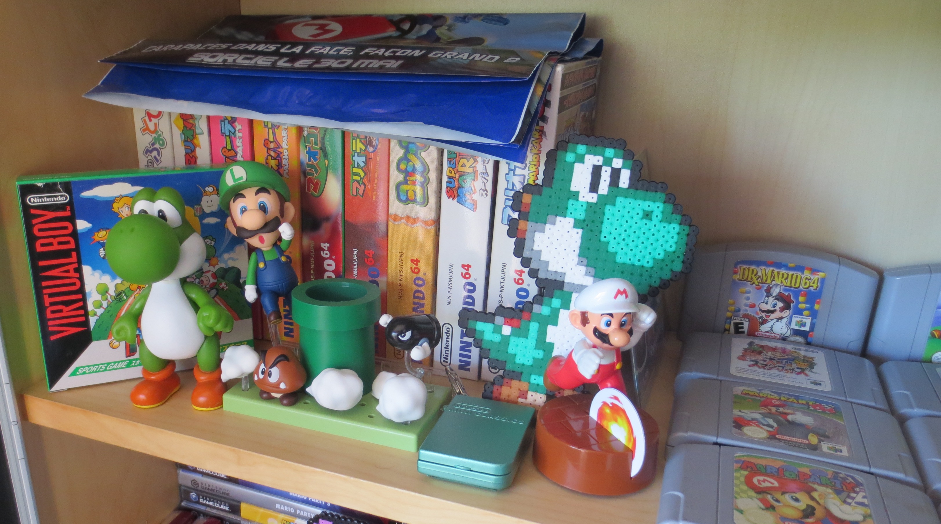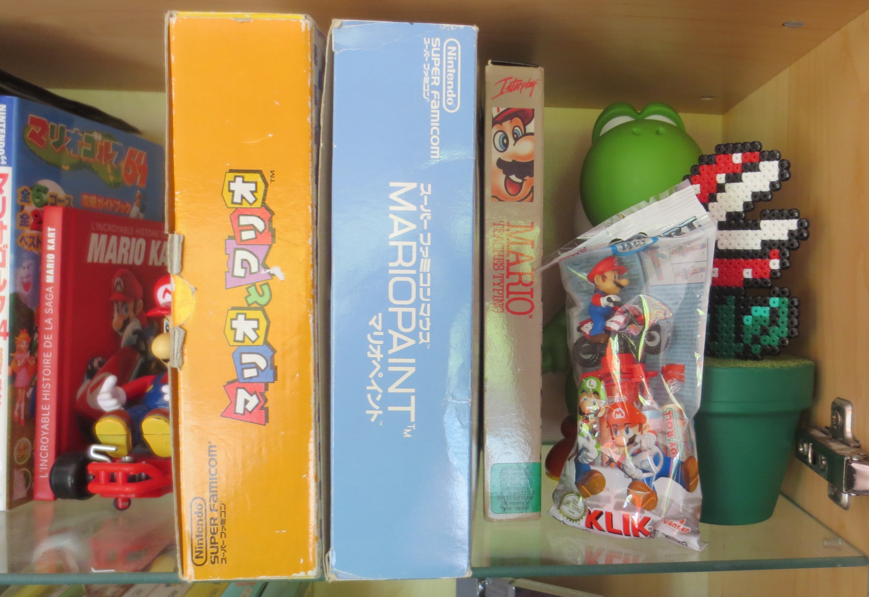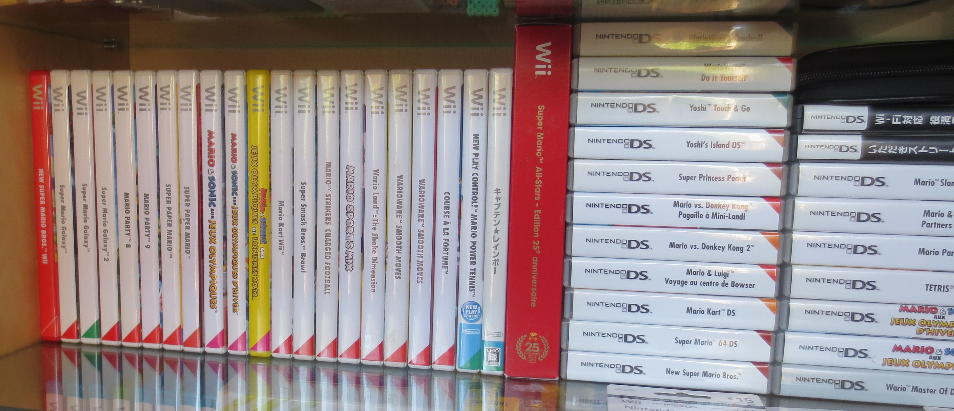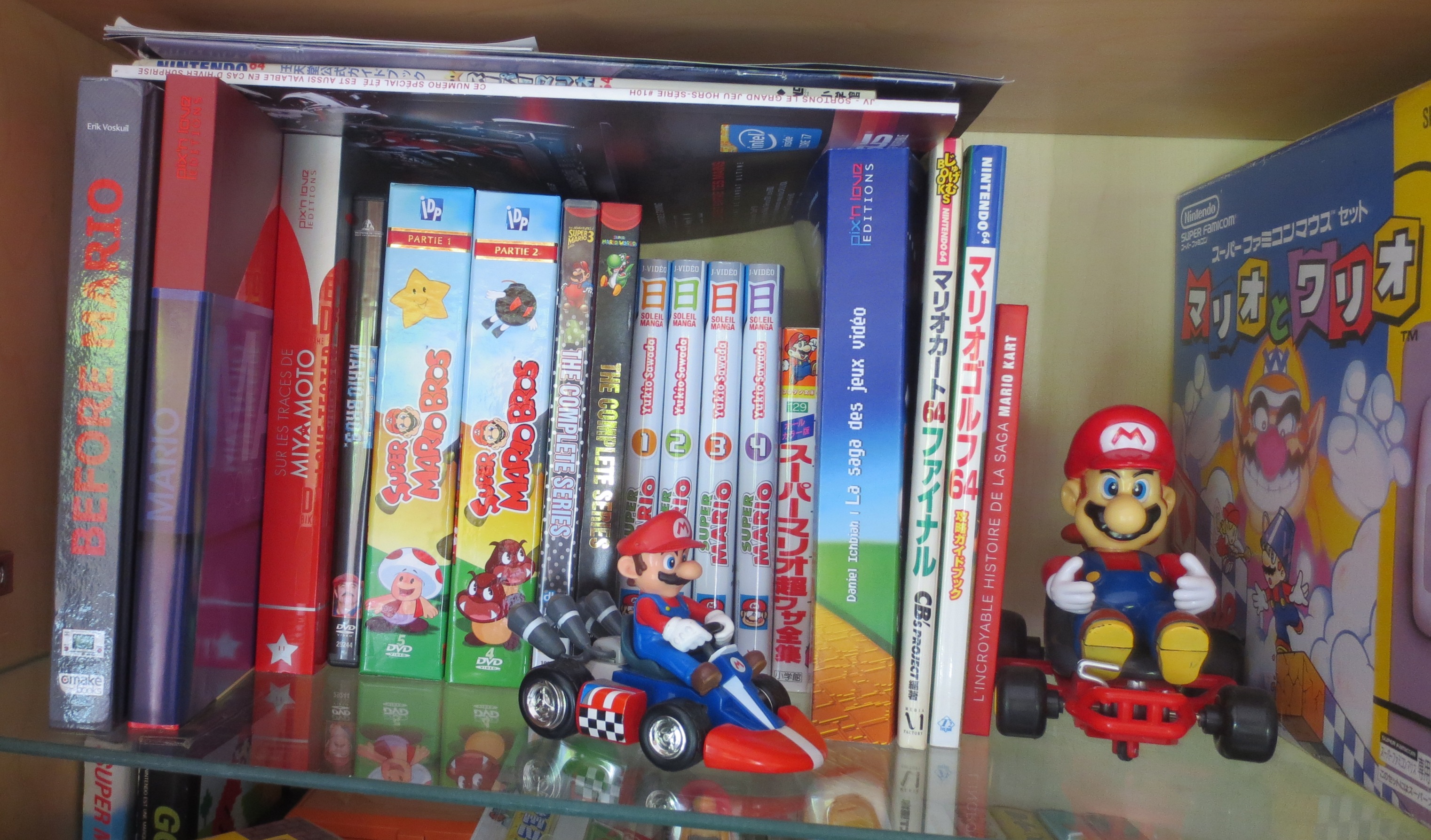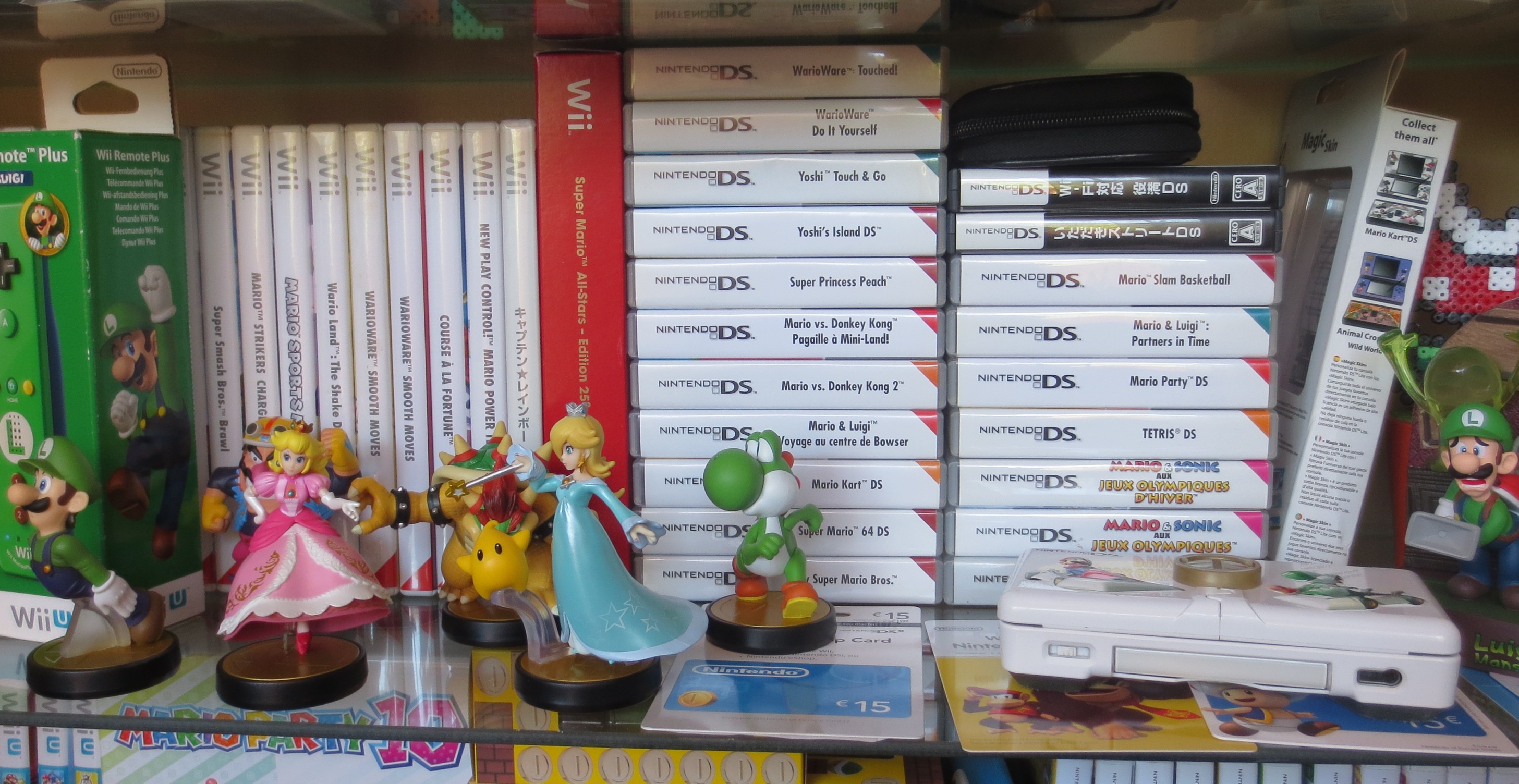 En juin 2014, j'avais fait un article sur ma collection de jeux Mario. Depuis, la collection a bien évolué, et j'ai eu envie de faire une mise à jour. Niveau jeu, j'en ai plus de 200 (240 au dernier décompte) et il m'en manque encore une quarantaine (dont la plupart ne sont jamais sortis du Japon et certains atteignent les 300 voire plus, du coup, je ne suis pas prêt à mettre la main dessus...). La collection peut toujours évoluer en remplaçant les jeux en loose par des jeux en boîte (sur console de salon, why not? sur console de portable, ça me tente moins) et en produits dérivés, il y a de quoi faire (j'ai d'ailleurs l'impression que Nintendo fait exprès de sortir de plus en plus de choses depuis que j'ai commencé à collectionner mais je dois être un peu parano). Bon, je mets les photos en vrac, elles sont rognées, en cliquant dessus, elles s'ouvrent en grand avec un petit commentaire à chaque fois sur le contenu de la photo. |