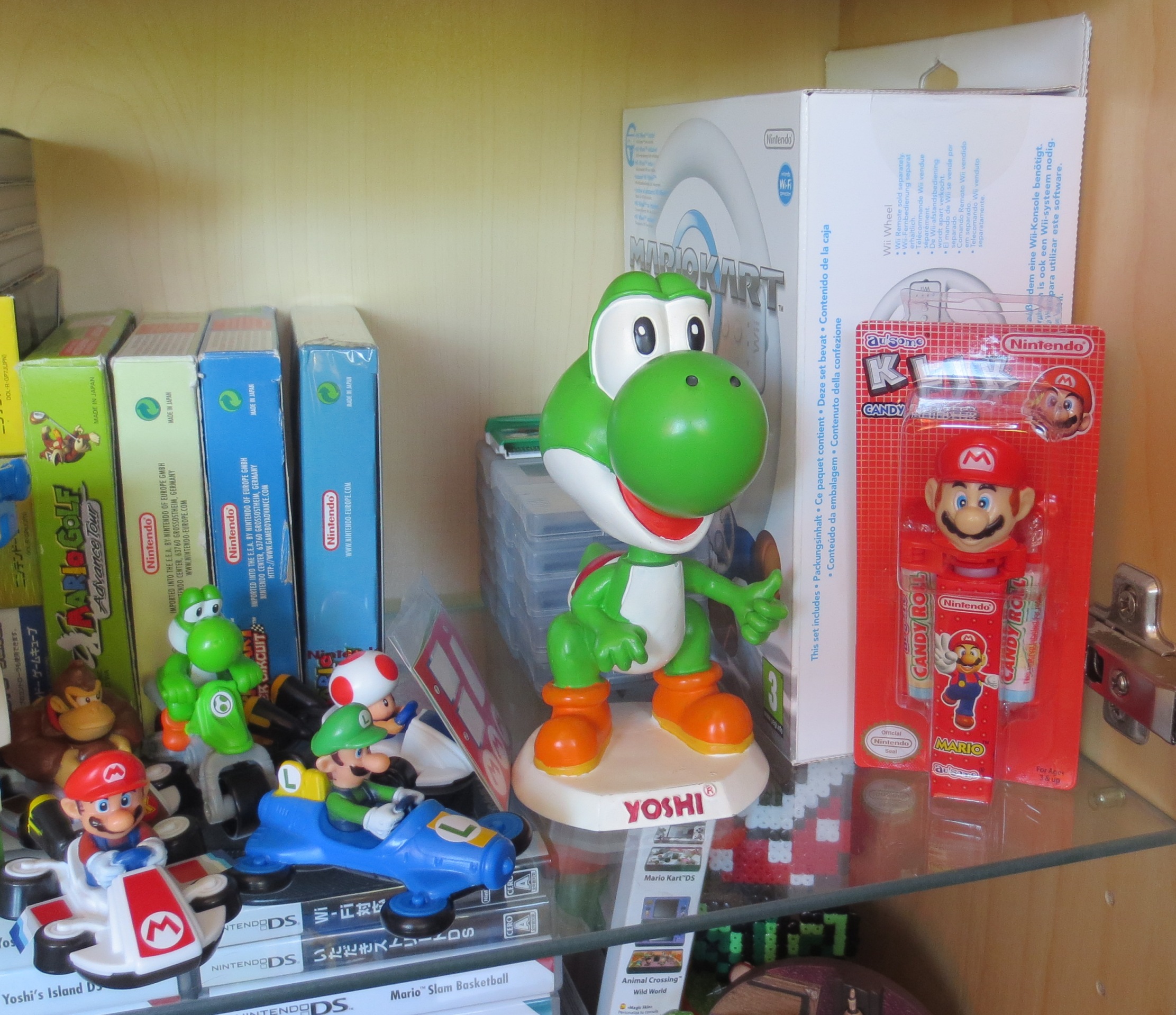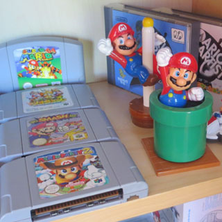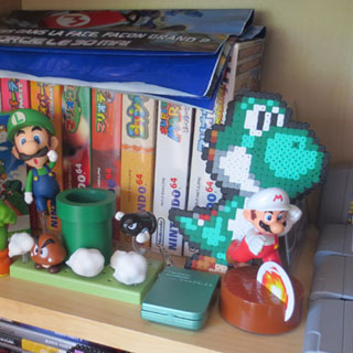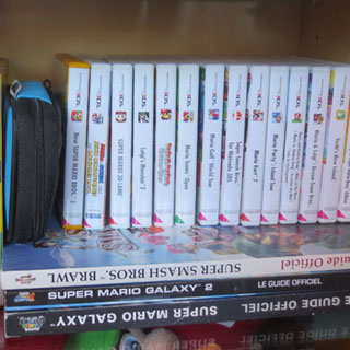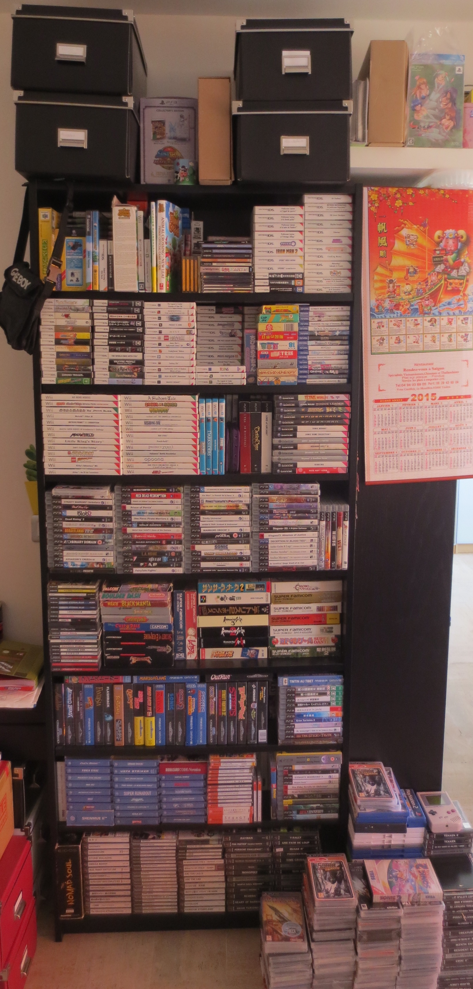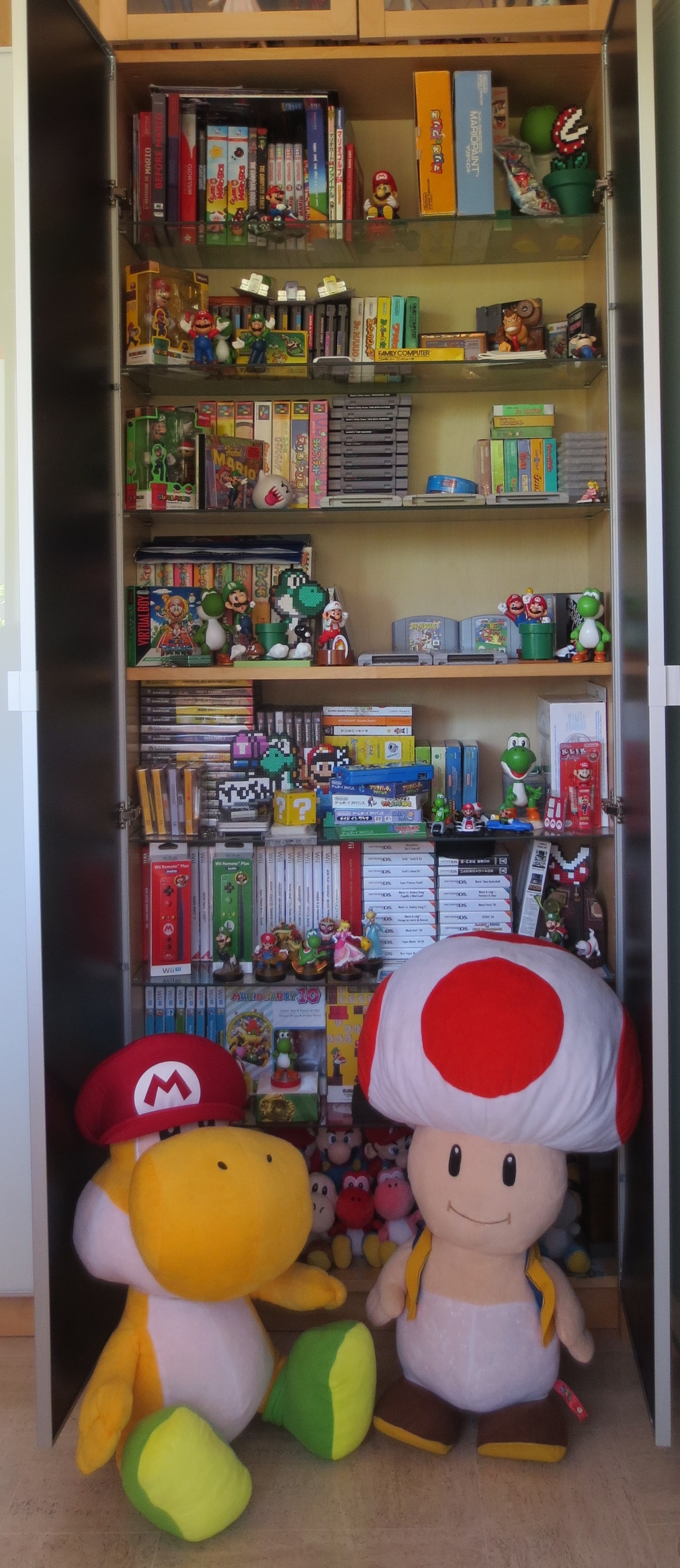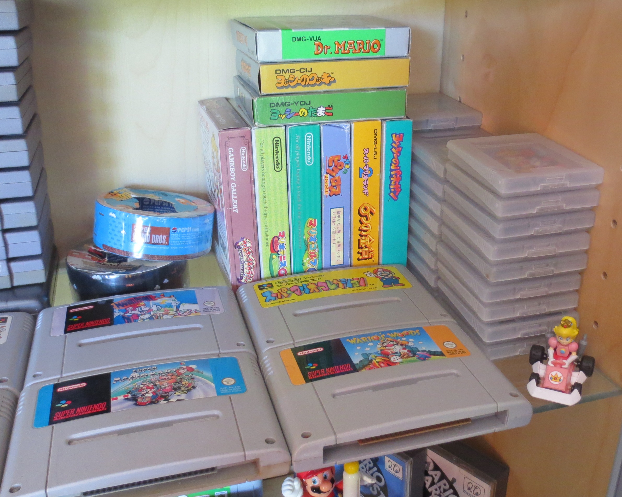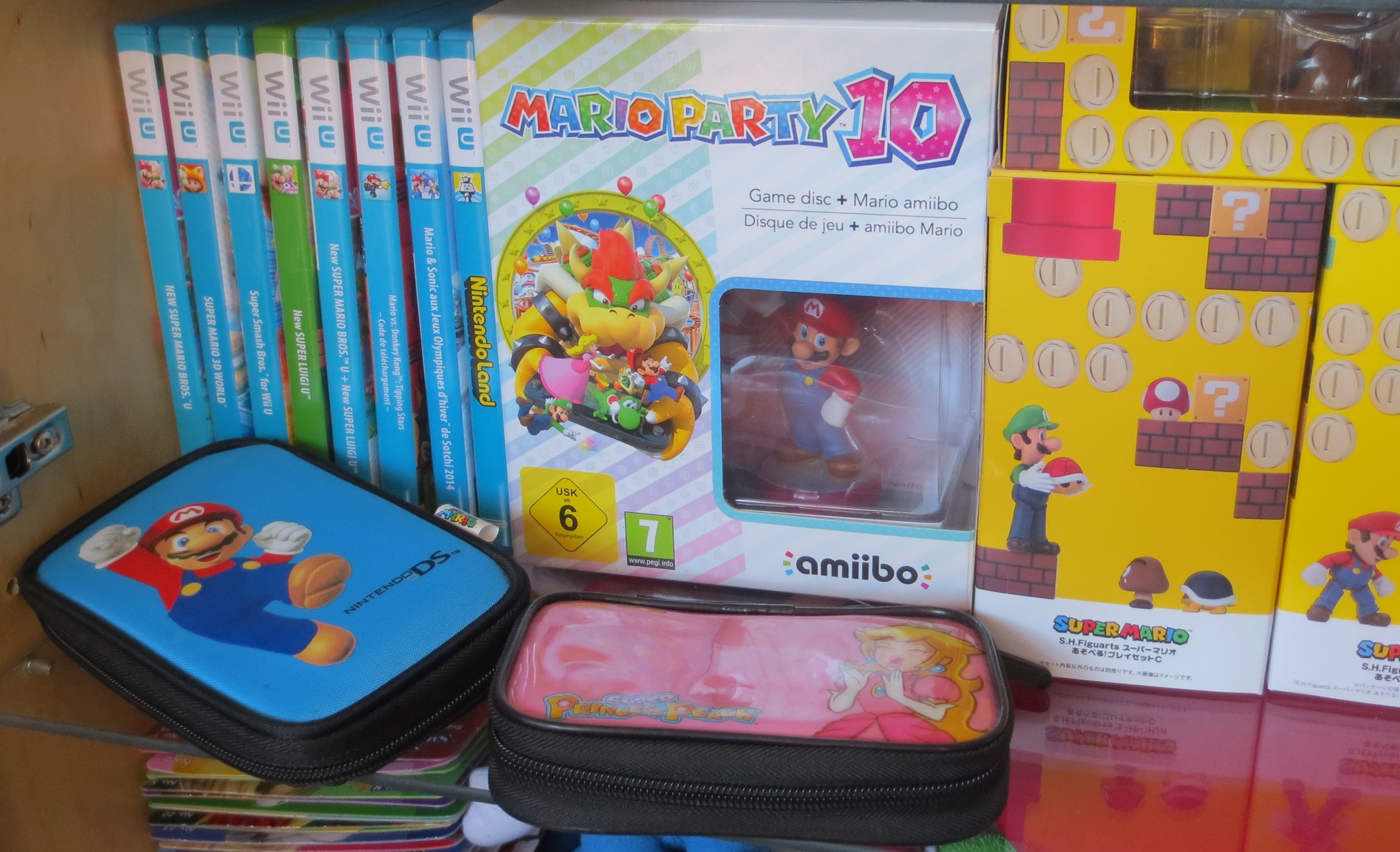 En juin 2014, j'avais fait un article sur ma collection de jeux Mario. Depuis, la collection a bien évolué, et j'ai eu envie de faire une mise à jour. Niveau jeu, j'en ai plus de 200 (240 au dernier décompte) et il m'en manque encore une quarantaine (dont la plupart ne sont jamais sortis du Japon et certains atteignent les 300 voire plus, du coup, je ne suis pas prêt à mettre la main dessus...). La collection peut toujours évoluer en remplaçant les jeux en loose par des jeux en boîte (sur console de salon, why not? sur console de portable, ça me tente moins) et en produits dérivés, il y a de quoi faire (j'ai d'ailleurs l'impression que Nintendo fait exprès de sortir de plus en plus de choses depuis que j'ai commencé à collectionner mais je dois être un peu parano). Bon, je mets les photos en vrac, elles sont rognées, en cliquant dessus, elles s'ouvrent en grand avec un petit commentaire à chaque fois sur le contenu de la photo. |