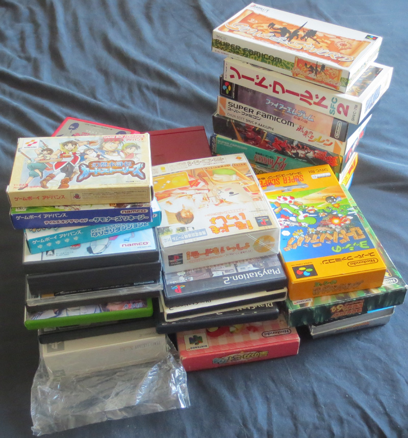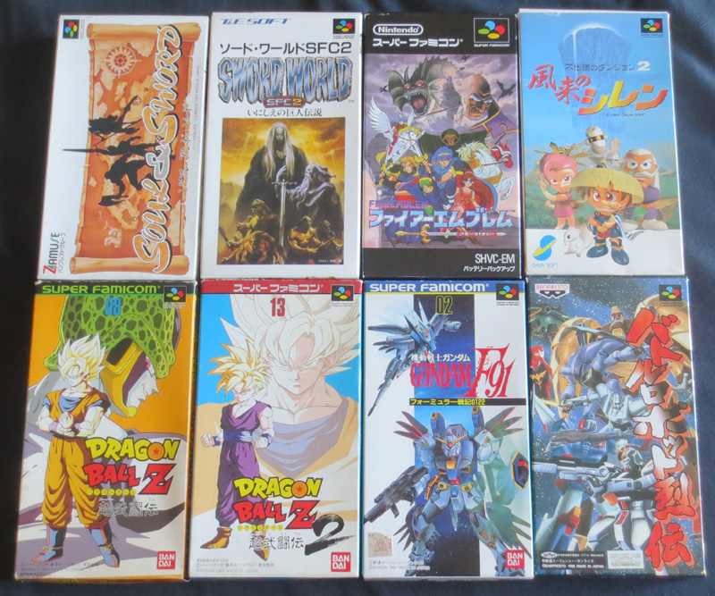 Joli lot de jeux Super Famicom en boîte. Deux DBZ complets, et dire que le Super Butouden 2, je l'avais payé 650F en import, alors que là, il m'a coûté moins de 10... Pour le reste, un Fire Emblem, quelques RPG et du Gundam.