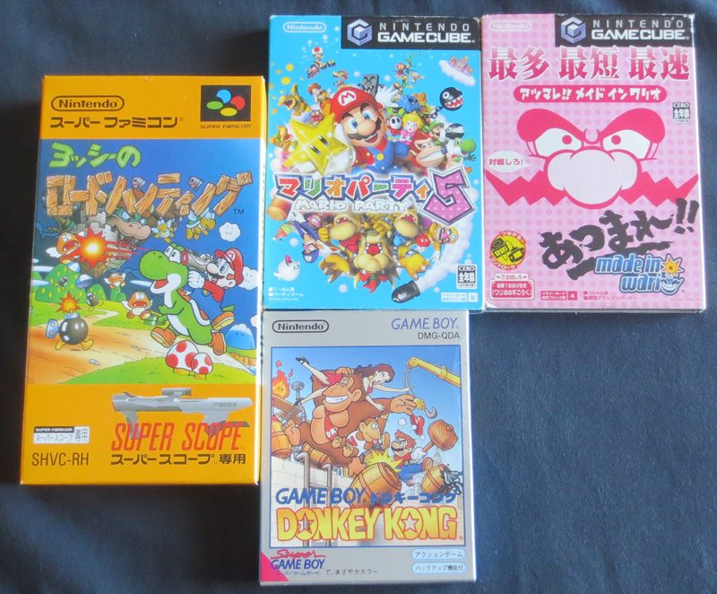 Du Mario, avec du vieux (DK sur GB), Yoshi Road Hunting (version japonaise de Yoshi's Safari) qui se joue avec le Nintendo Scope (ça tombe bien, j'en ai trouvé un en vide-grenier ce week-end !) et du plus récent avec Mario Party et Wario sur GC.