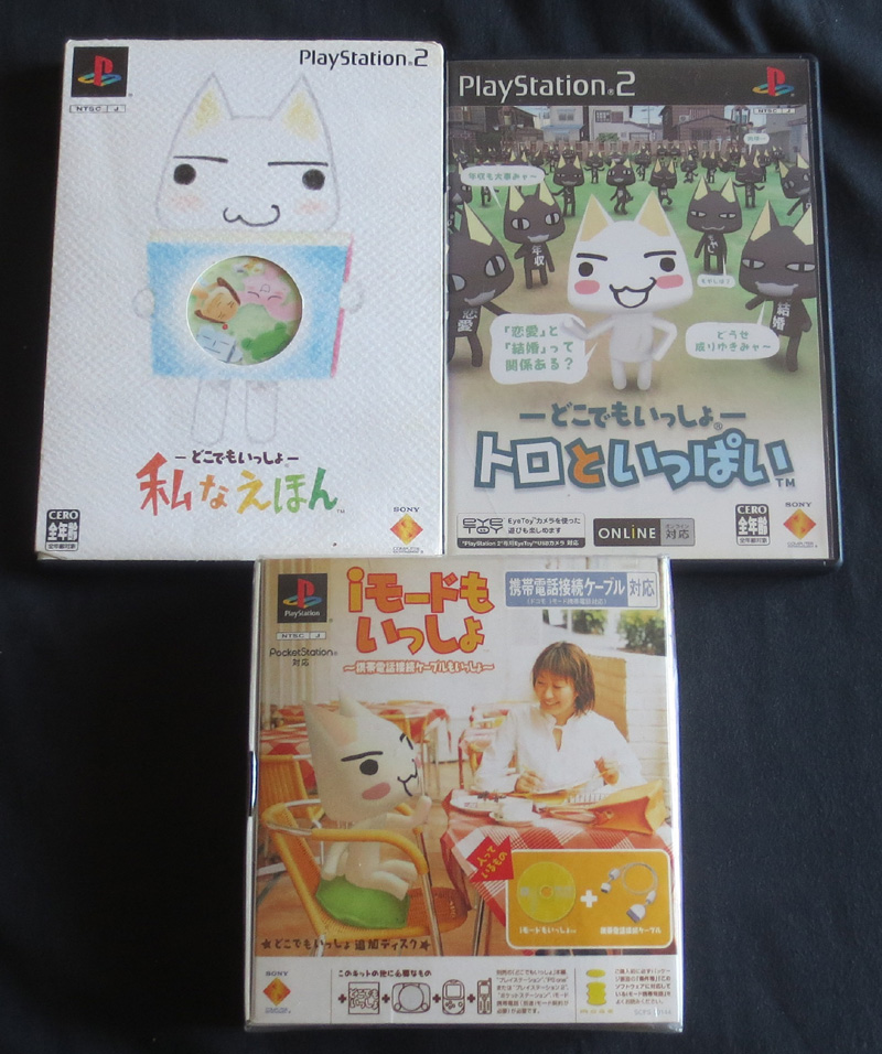Petit arrivage spécial Dokodemo, le premier, c'est bête, je l'avais déjà, mais là, il y a un joli fourreau cartonné autour, c'est chouette. Celui du bas, je ne sais pas trop à quoi il sert, en tout cas, je ne suis pas prêt de le tester vu qu'il faut un PocketStation (la Visual Memory de la PS), mais aussi et surtout un téléphone japonais, ah ah... Bon, le précédent possésseur ne l'avait même pas utilisé puisque le CD est encore sous blister...
