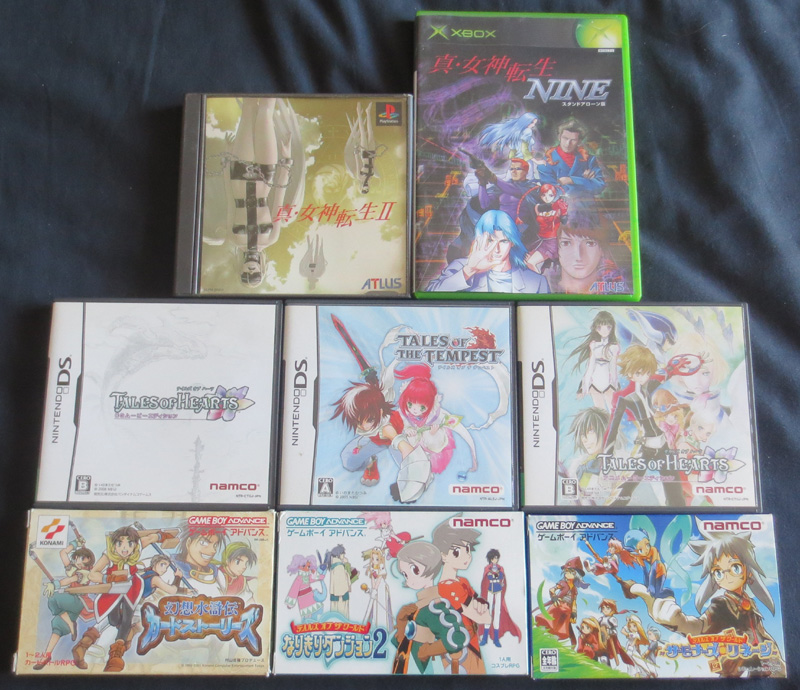 Du RPG, avec le SMT sorti sur Xbox (qui passe sur ma Xbox trafiquée !) et SMT2 sur Snes. Pas mal de Tales sur GBA (Tales of the World) et sur DS (Tales of Hearts version animé et version CG et Tales of the Tempest), à part Hearts sorti dans sa version R, ces jeux ne sont pas sortis du Japon. En bonus, un Suikoden 2 sur GBA qui semble être un jeu de cartes (il y a un petit booster avec 3 cartes dans la boîte).