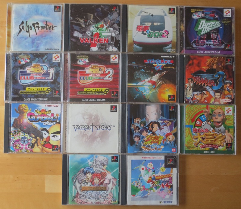 Autour de la PS1 avec quelques classiques que je n'avais pas en Japonais (SaGa Frontier, Vagrant Story). Je suis content pour le Valken, mais je ne sais pas s'il sera au niveau de la version sur Snes. Et il y a même du Legend of Heroes en bas au milieu.