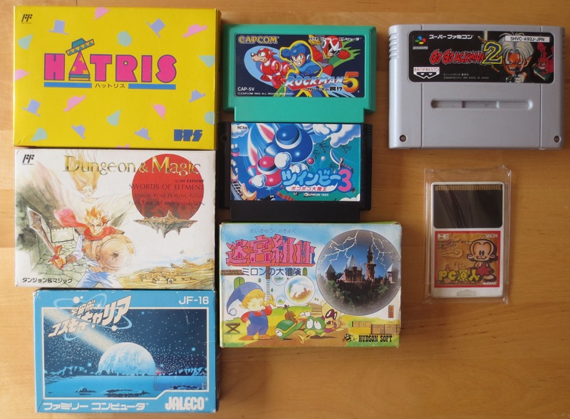 Quelques jeux Nes en boîte, mais rien de folichon (même si le Hatris est en excellent état). Un Megaman 5 pour revendre, et un PC Genjin sur PC Engine (uh uh, ils se sont bien marrés quand ils ont trouvé le nom).