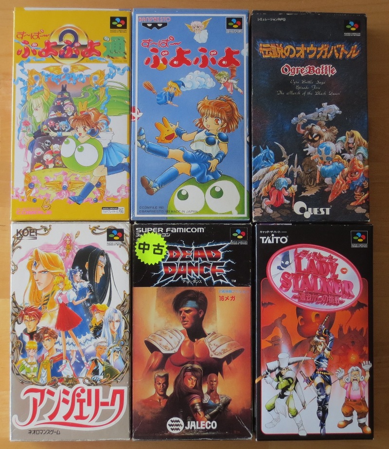 Et pour fini, gros arrivage de jeux Super Famicom. Bon, pas de gros gros titres, mais ça reste toujours sympa d'avoir ces jeux complets en boîte. Du Puyo Puyo, du Ogre Battle et Lady Stalker, par l'équipe qui a fait Landstalker (mais il a une moins bonne critique...)