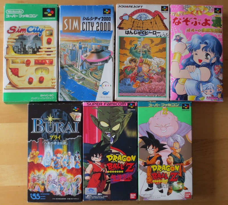 Encore du Puyo (j'aurai dû le mettre sur l'autre photo...), deux Sim City (ça va bien avec le Sim City Jr. que j'ai trouvé il y a 2 jours !) et surtout deux Dragon Ball, donc le Butouden 3 qui est en excellent état.