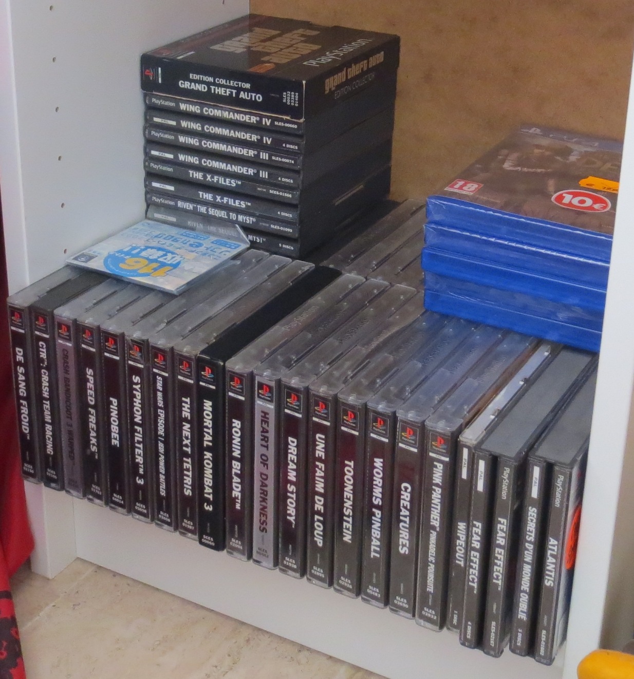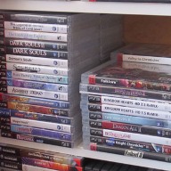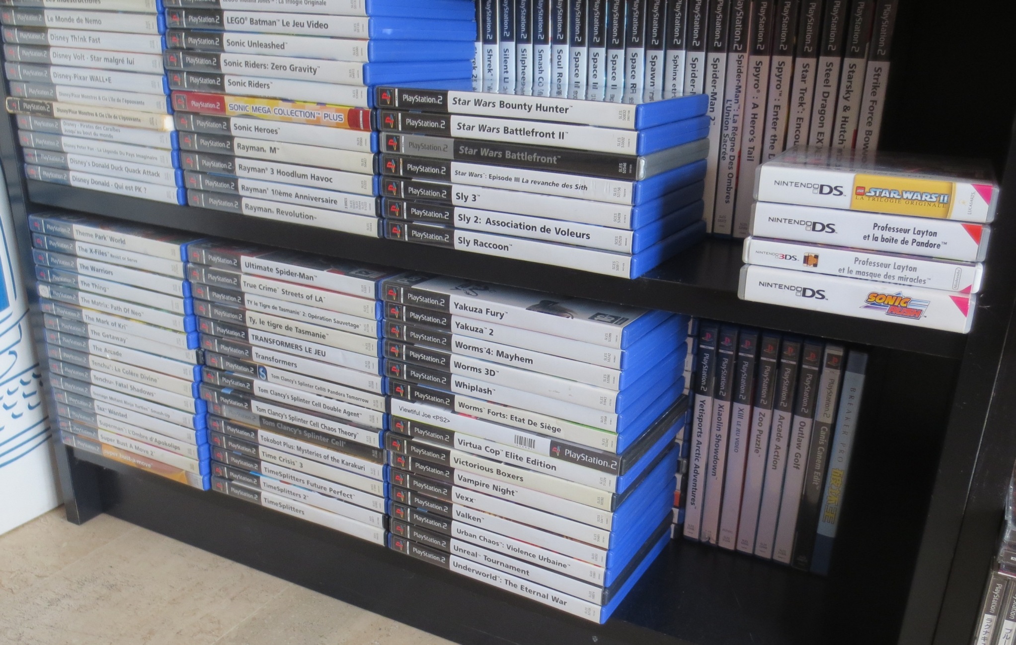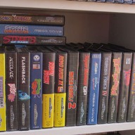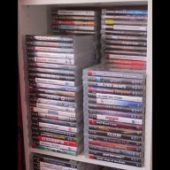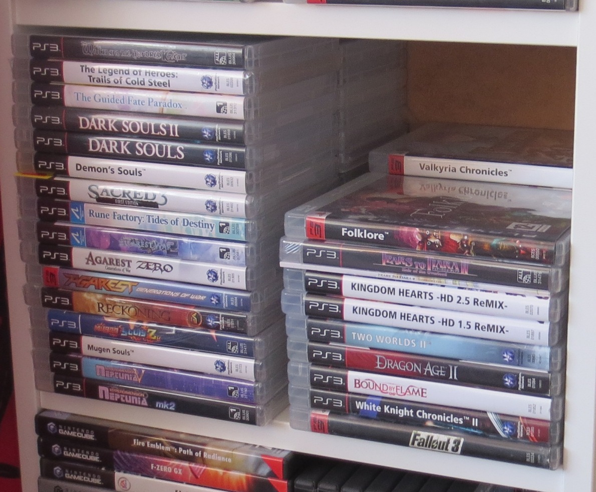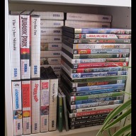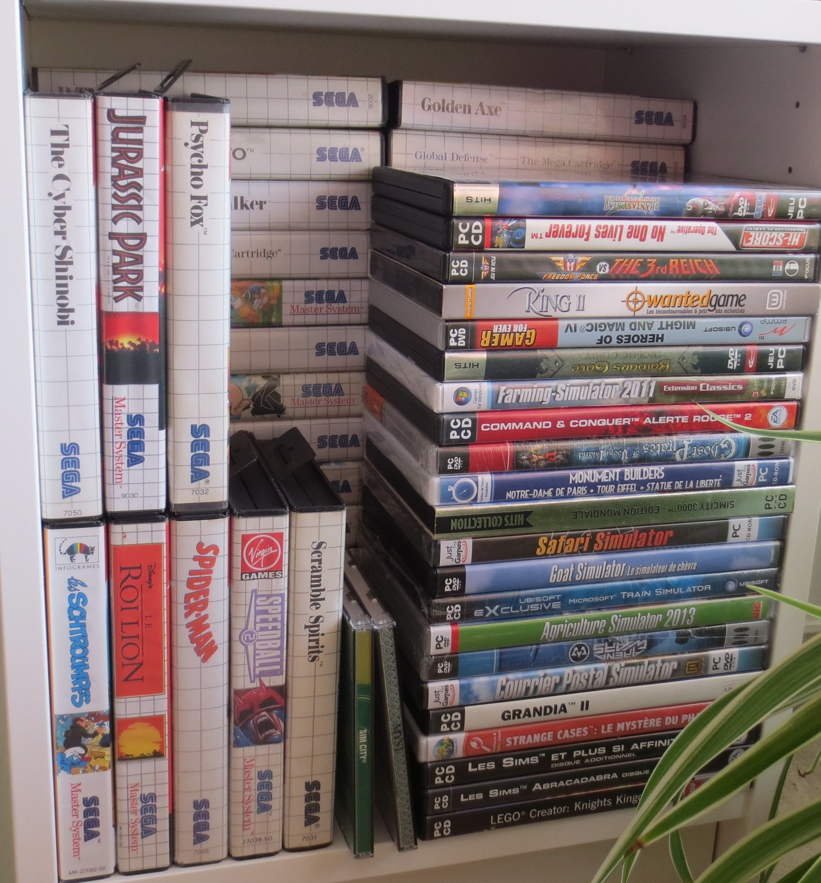 mais pas forcément les jeux les plus intéressants devant). Les jeux en loose sont également absents, et ça représente tout de même une grosse partie de la collection. Donc pas de jeux Nes, Snes, Famicom, MD ou N64 sur les photos. La flemme d'ouvrir les cartons... Un jour, je sortirai peut-être tous les jeux de leurs boîtes pour le fun... Mais quand je pense au temps que ça me prendrait, généralement, ça me démotive !