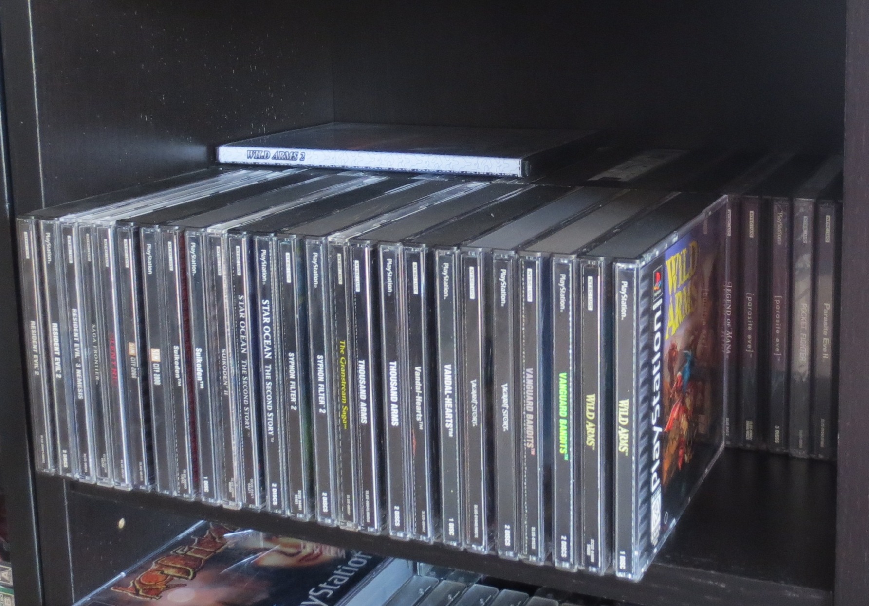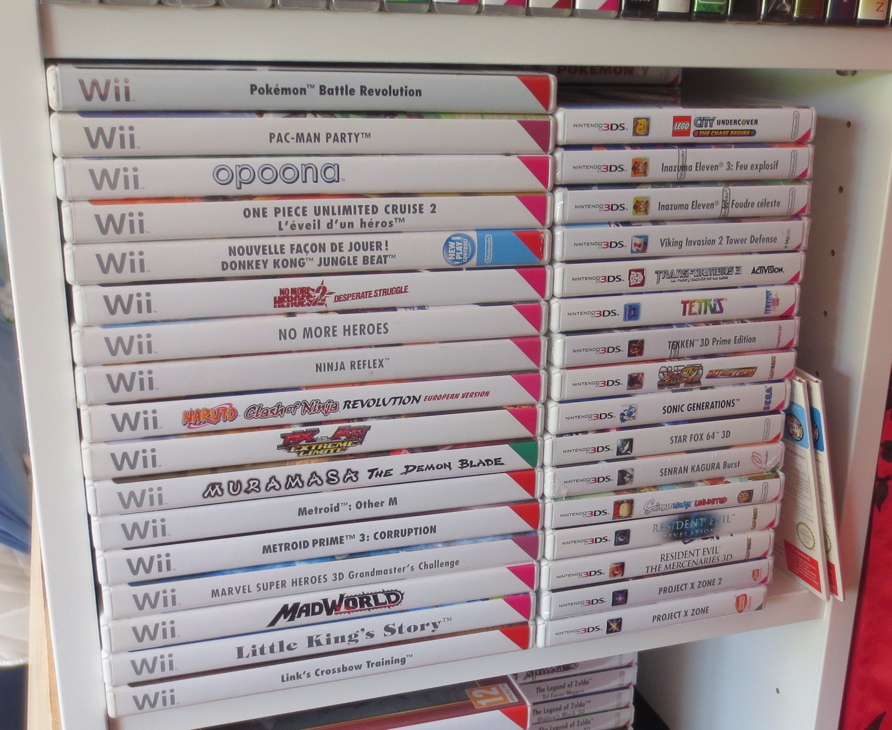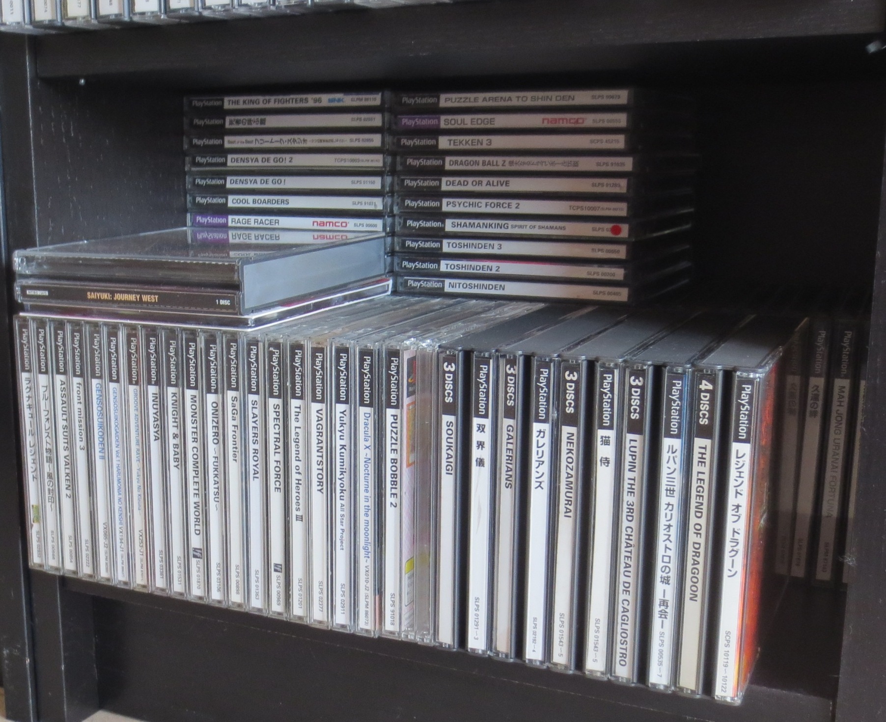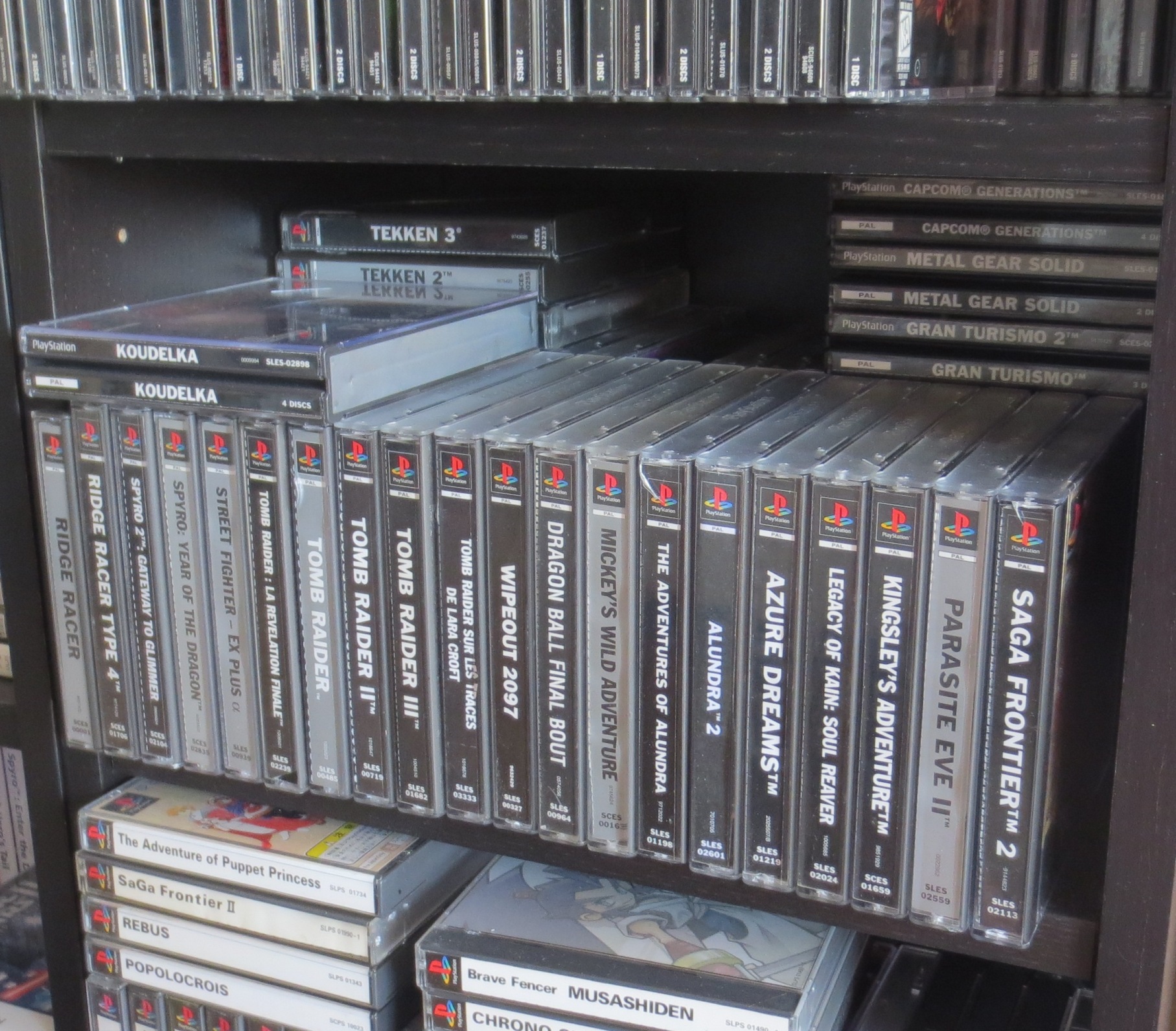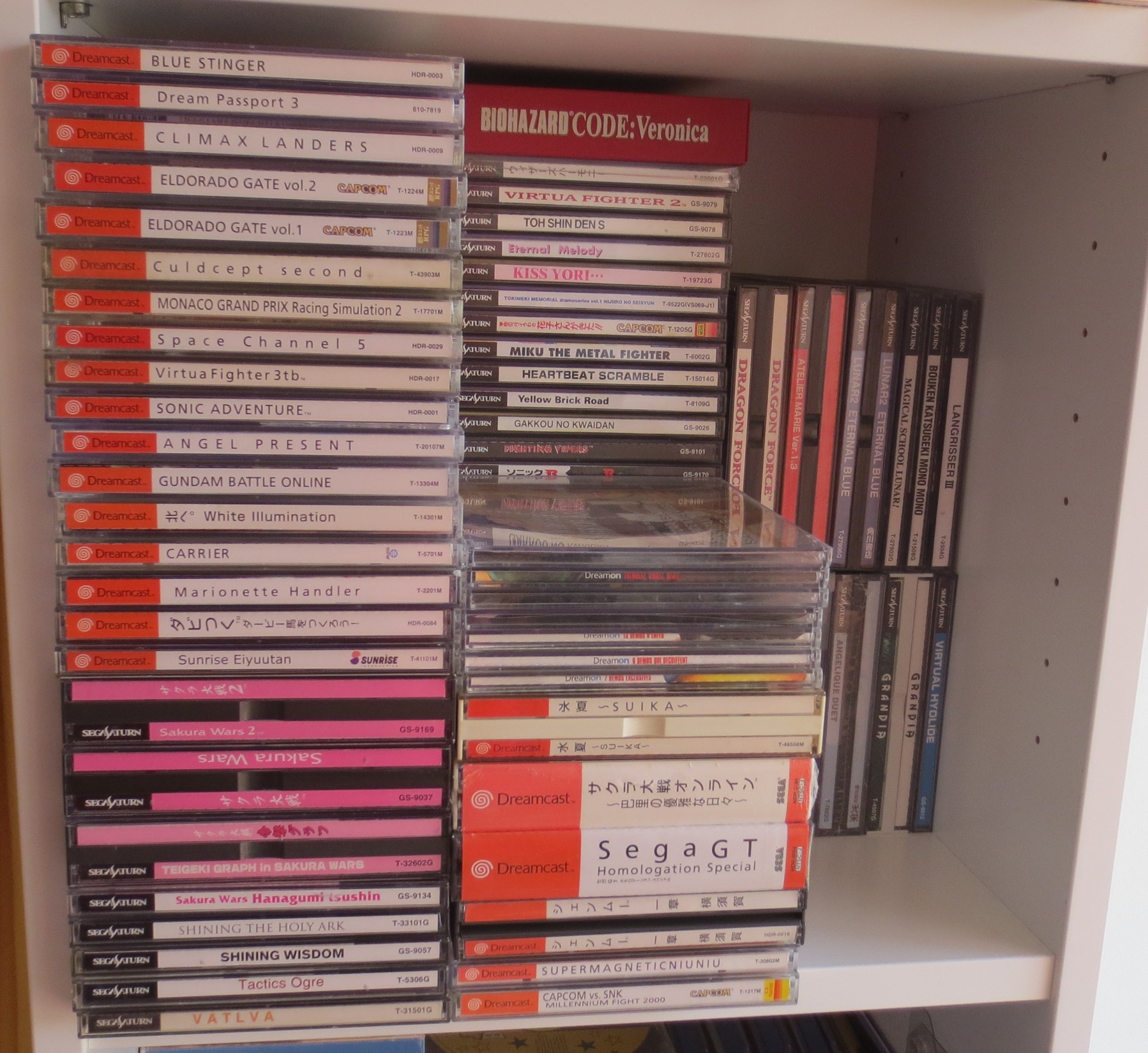 mais pas forcément les jeux les plus intéressants devant). Les jeux en loose sont également absents, et ça représente tout de même une grosse partie de la collection. Donc pas de jeux Nes, Snes, Famicom, MD ou N64 sur les photos. La flemme d'ouvrir les cartons... Un jour, je sortirai peut-être tous les jeux de leurs boîtes pour le fun... Mais quand je pense au temps que ça me prendrait, généralement, ça me démotive !