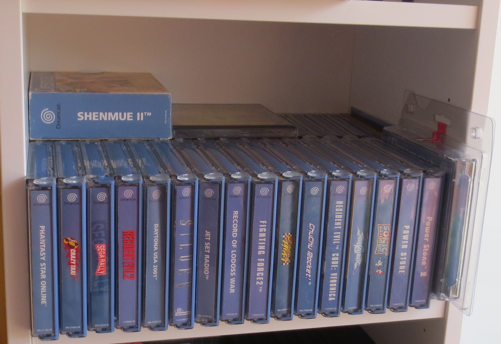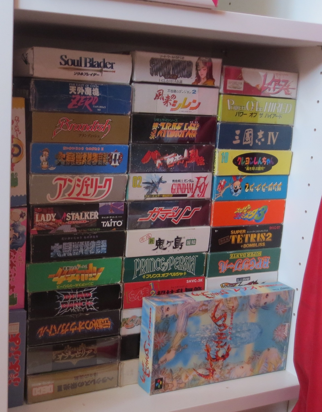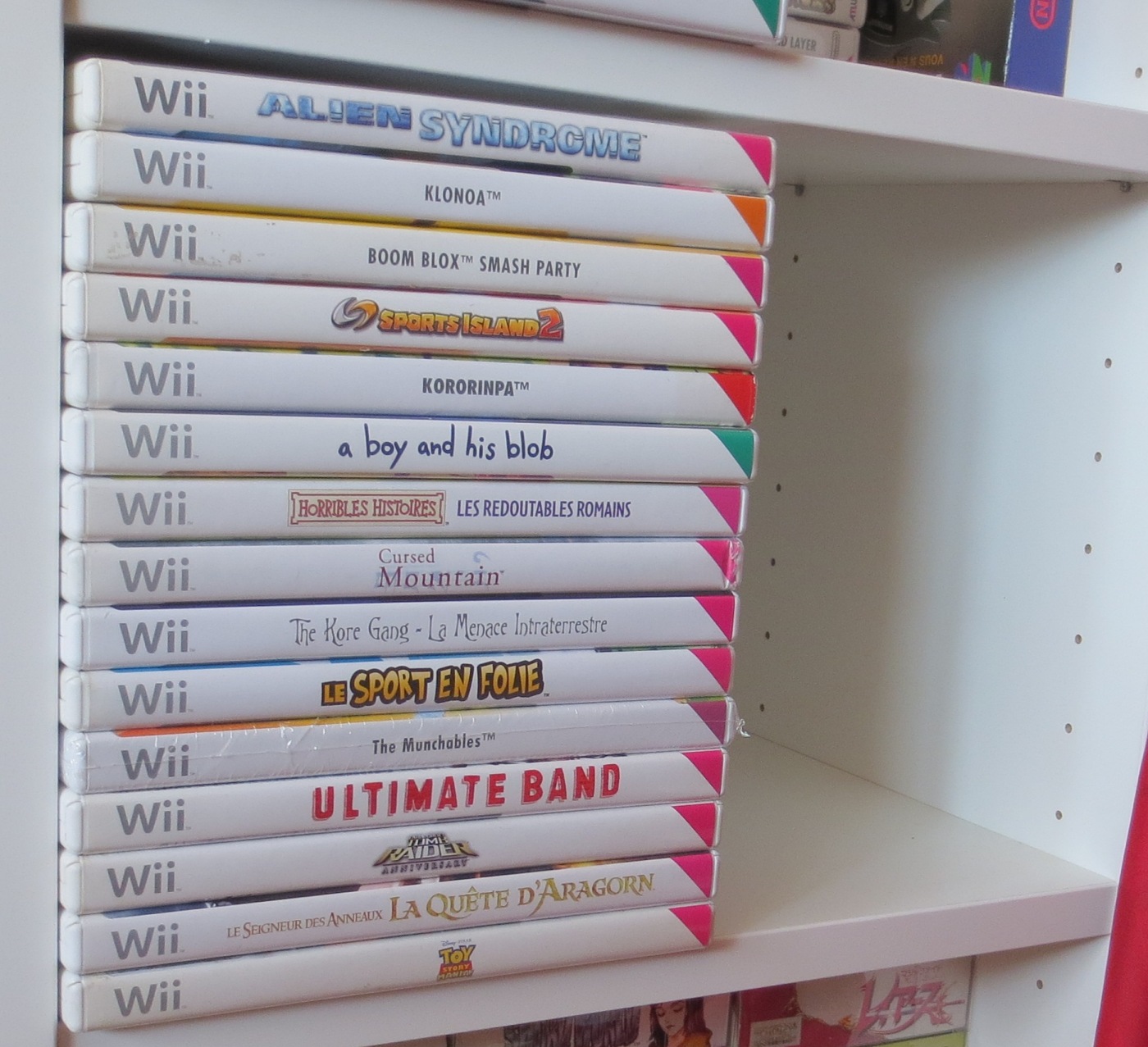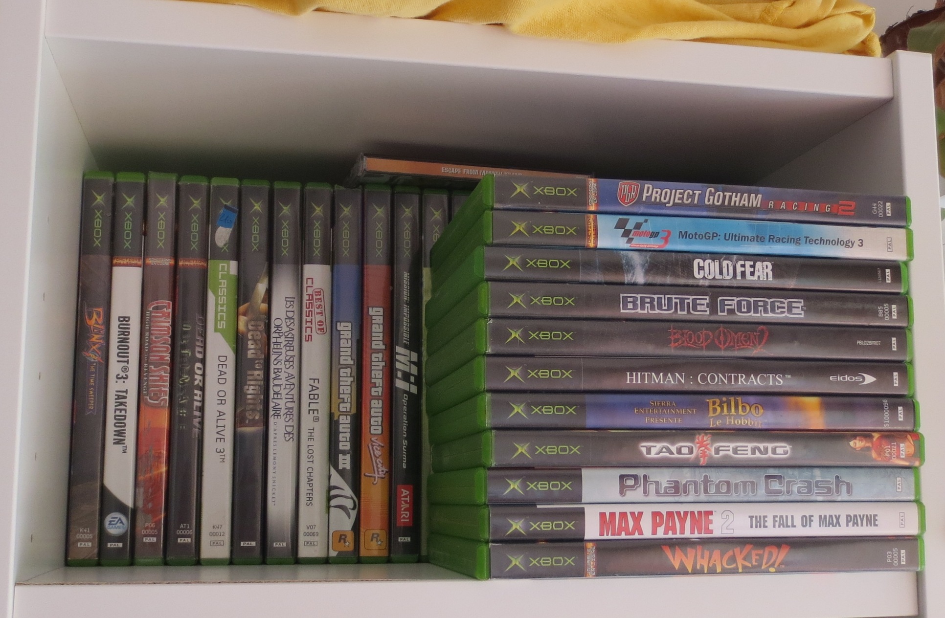 mais pas forcément les jeux les plus intéressants devant). Les jeux en loose sont également absents, et ça représente tout de même une grosse partie de la collection. Donc pas de jeux Nes, Snes, Famicom, MD ou N64 sur les photos. La flemme d'ouvrir les cartons... Un jour, je sortirai peut-être tous les jeux de leurs boîtes pour le fun... Mais quand je pense au temps que ça me prendrait, généralement, ça me démotive !